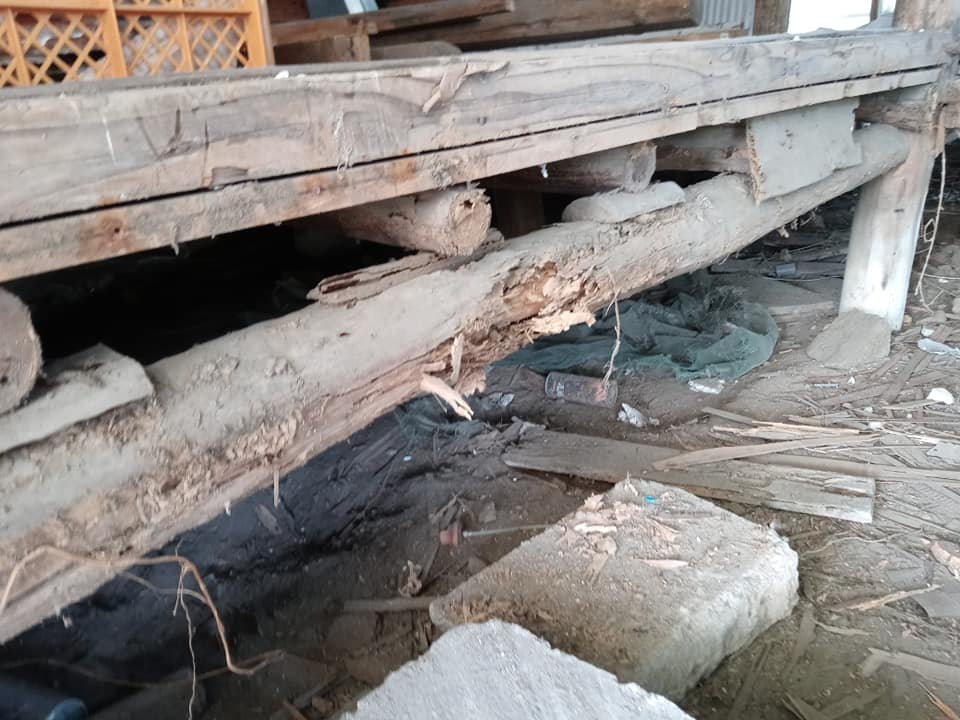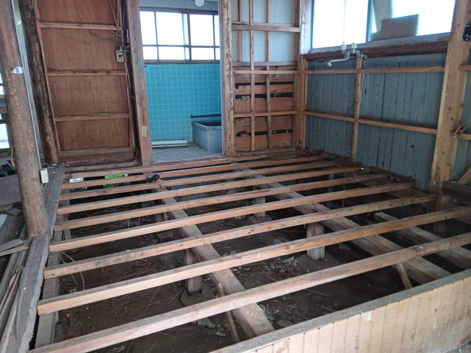ダメだったので、壁周りの土台と柱だけを残して床面は解体となりました。