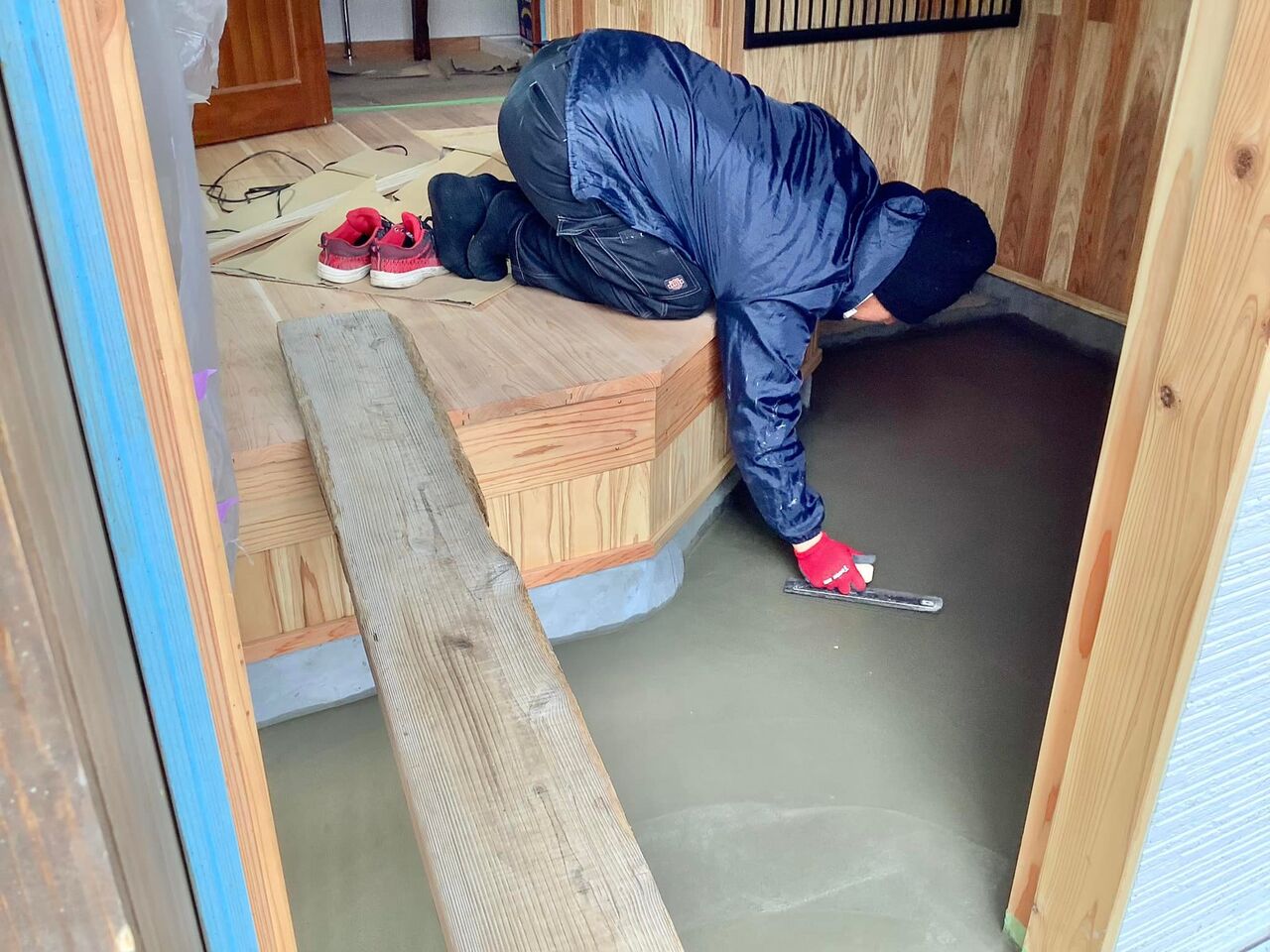 ⑬そして玄関土間床と引き扉の敷居周辺の最終仕上げは、やはりプロに頼みました。