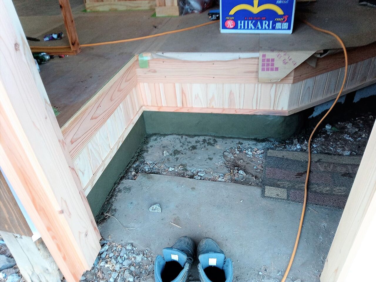 玄関は引き戸が来るので、玄関内に水の浸入が無いように少し高さを上げる必要がありました。