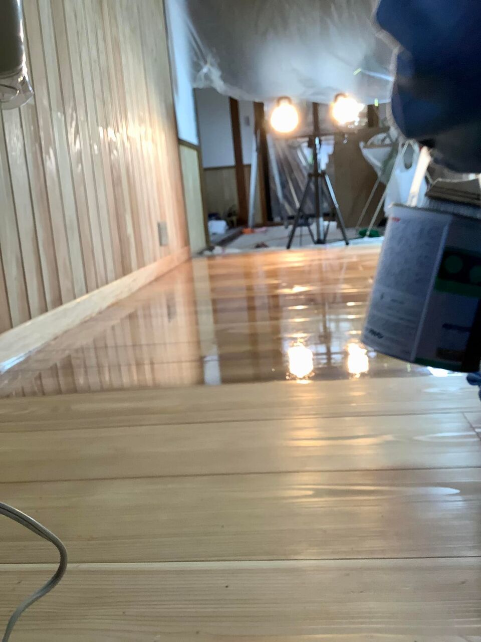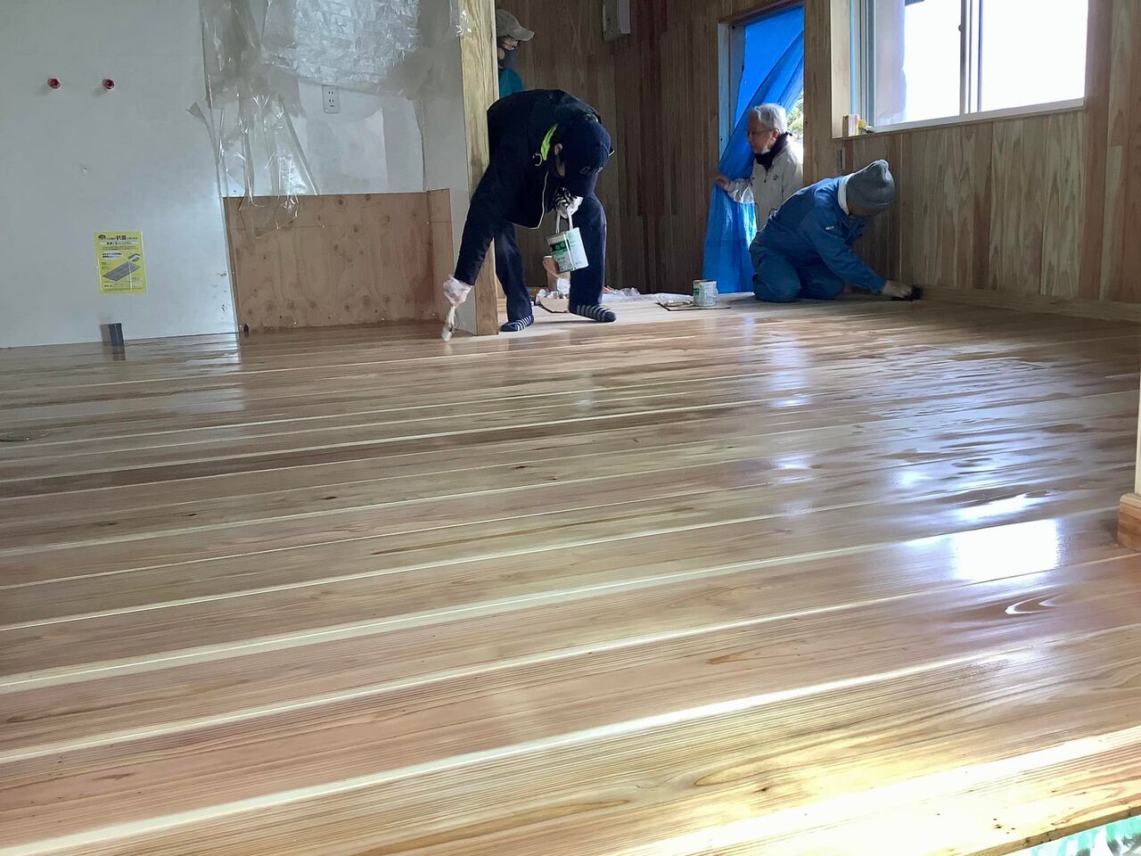 床は2度塗りで傷をつけにくくするので、5人がかりで1日作業で終わらせます。