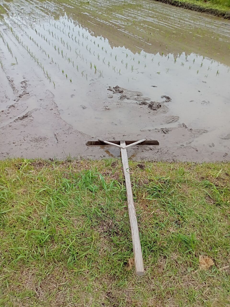 機械で植えて、ちなみに、このレーキは、田植え機のワダチの跡を直すためにつかいま〜す。