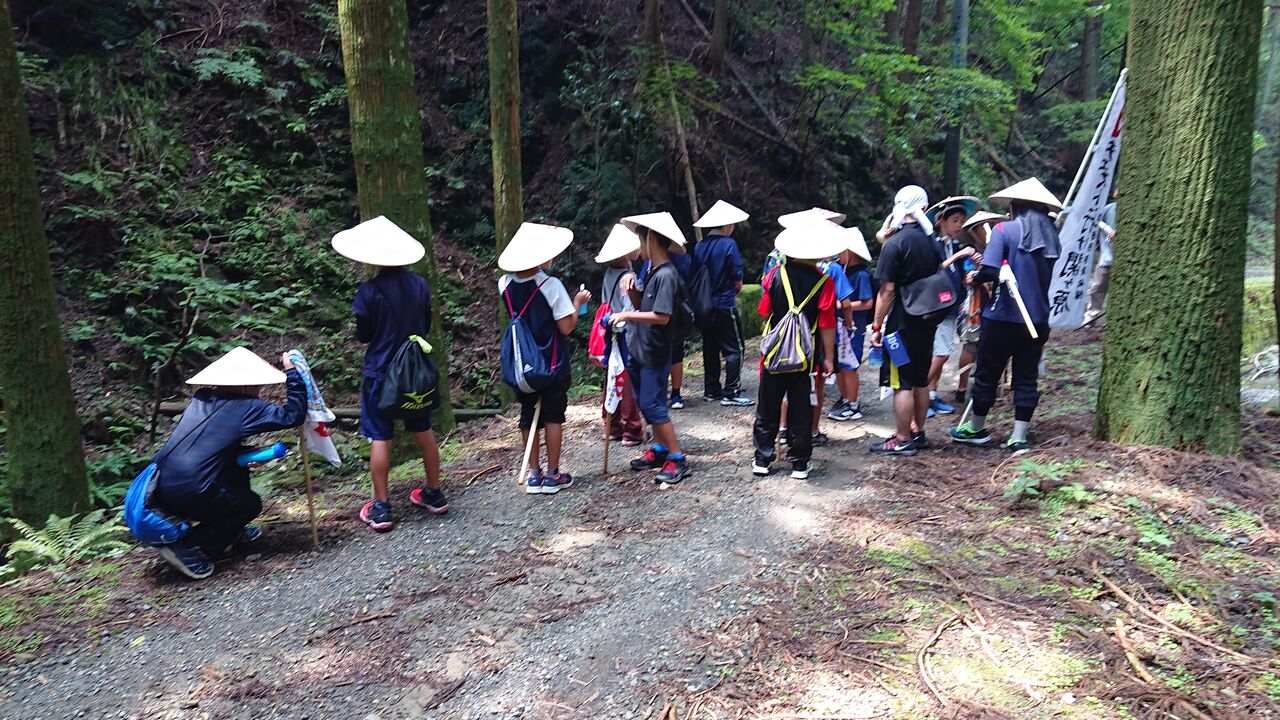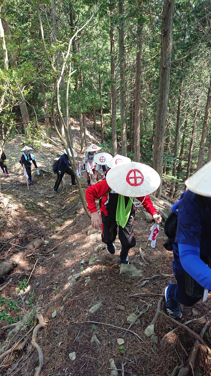 この出発地点からいきなり、1日目の難所「駒野越え」になります。ひと一人がやっと通れるような急な山道を約2時間上り続けます。途中の休憩も間隔を短くし、できるだけ脱落者が出ないように歩きます。(当然救護車なんて入れません。)