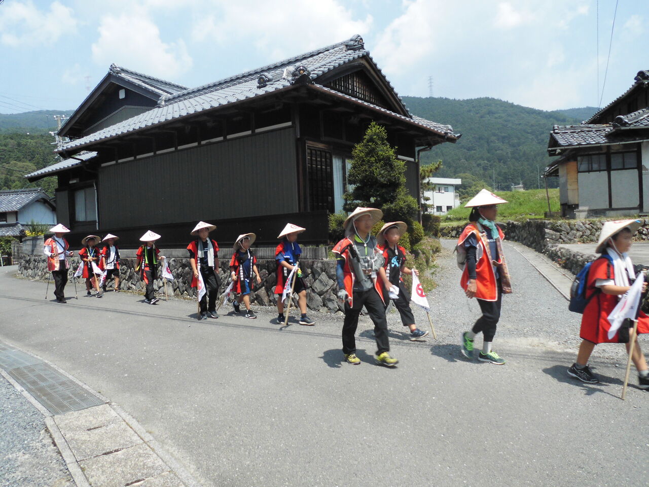 地元の方々に見送られ次の目的地へと元気よく出発していきます。通常歩くときは鐘を鳴らしながら歩きますが、鐘の音を聞いた方々が沿道に出てきて子どもたちを激励してくれます。この光景は地元の方々の温かさを感じ、なかなかの感動を呼びます。