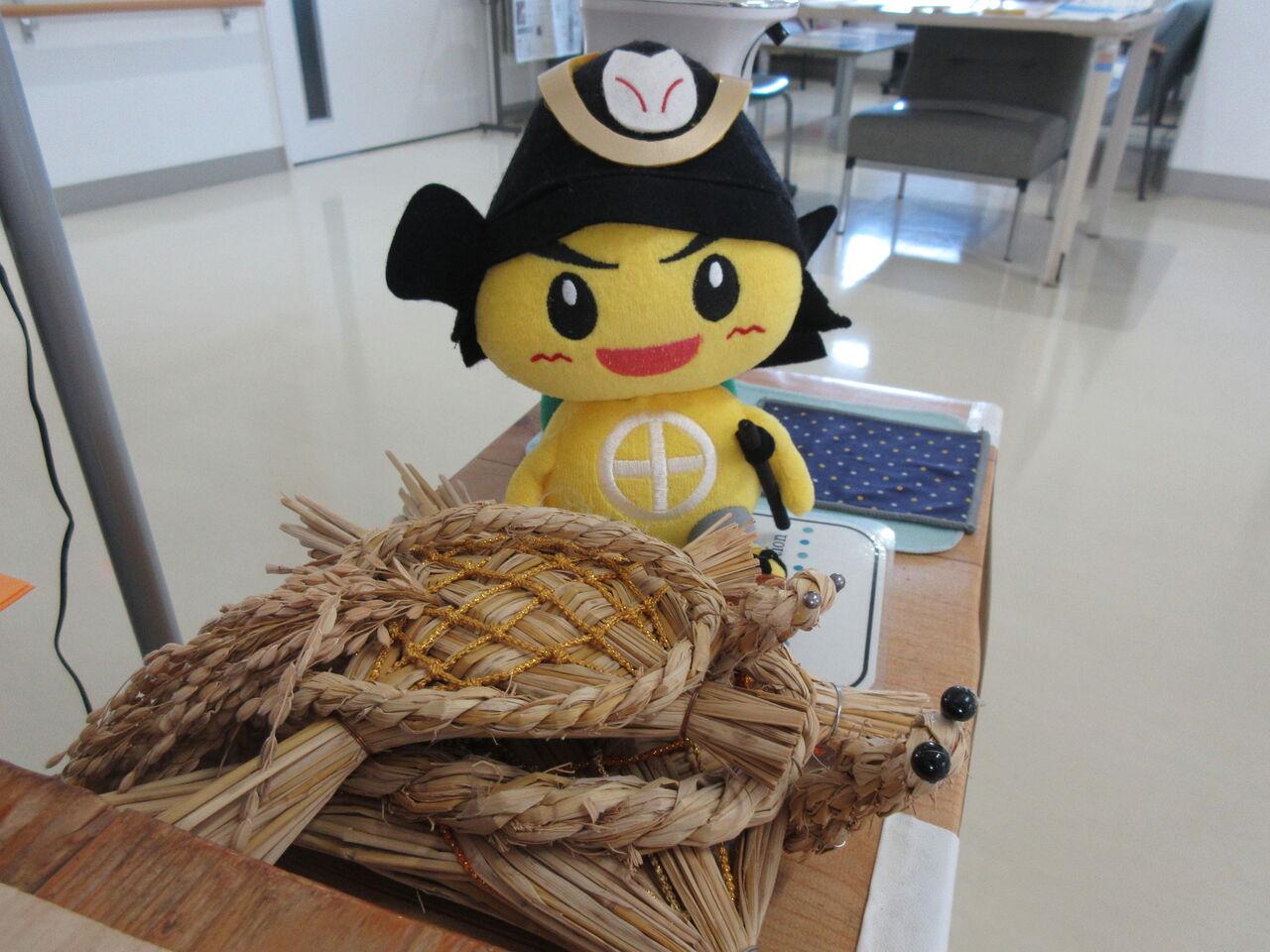 ひお吉くんと写っているのは、器用にわらで編まれた「かめの親子」。