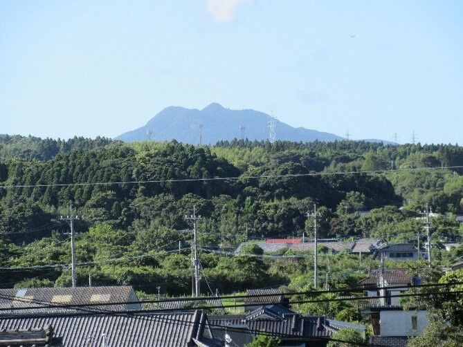 一歩入ると真正面には、目の前に広がる日吉町の山々。そこに見える漢字の山のような山と思いきや、女性の寝ている姿だそうで、なんとも魅惑な「金峰山」。