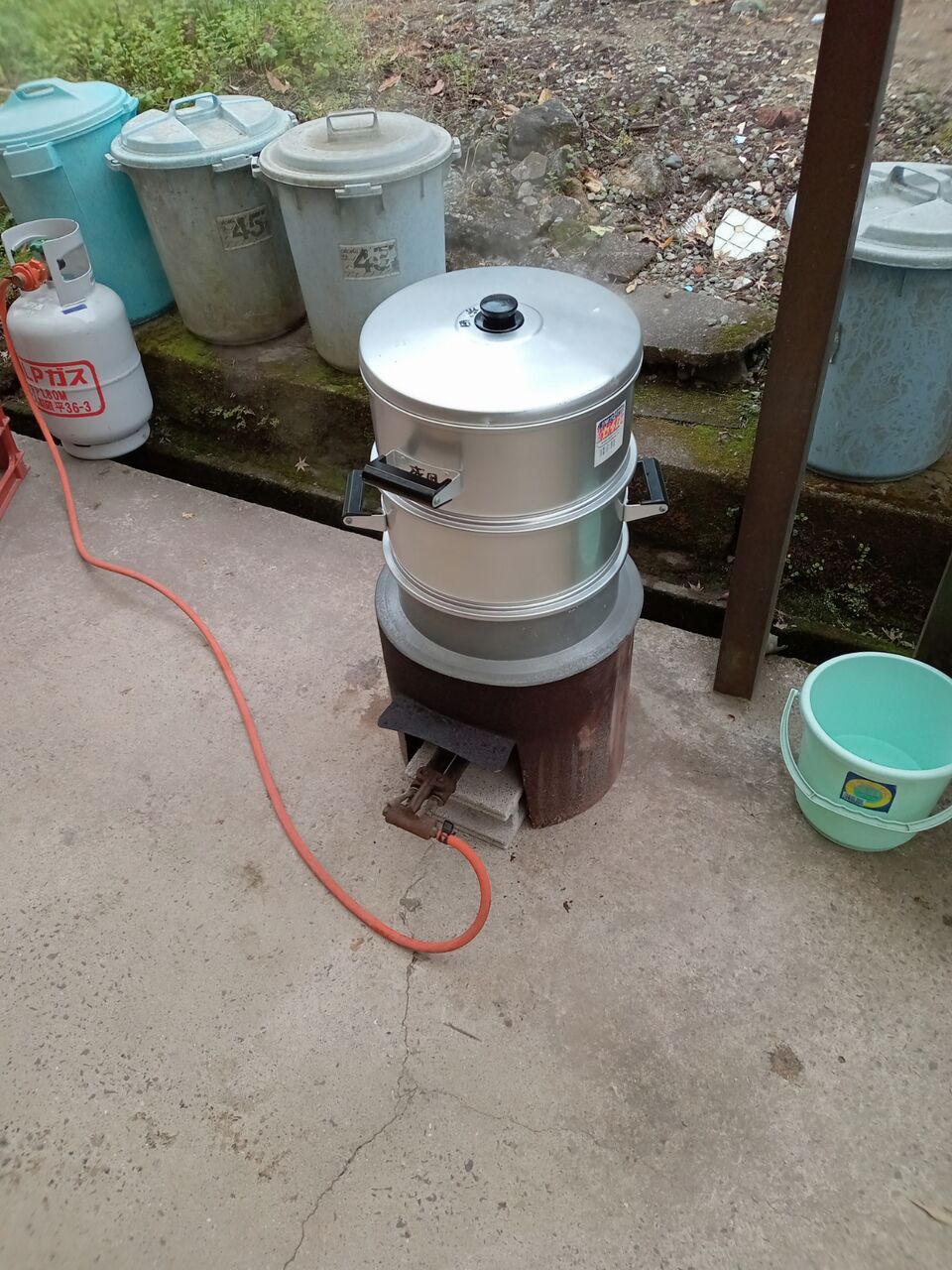前日湿した、モチ米をセイロで蒸します。