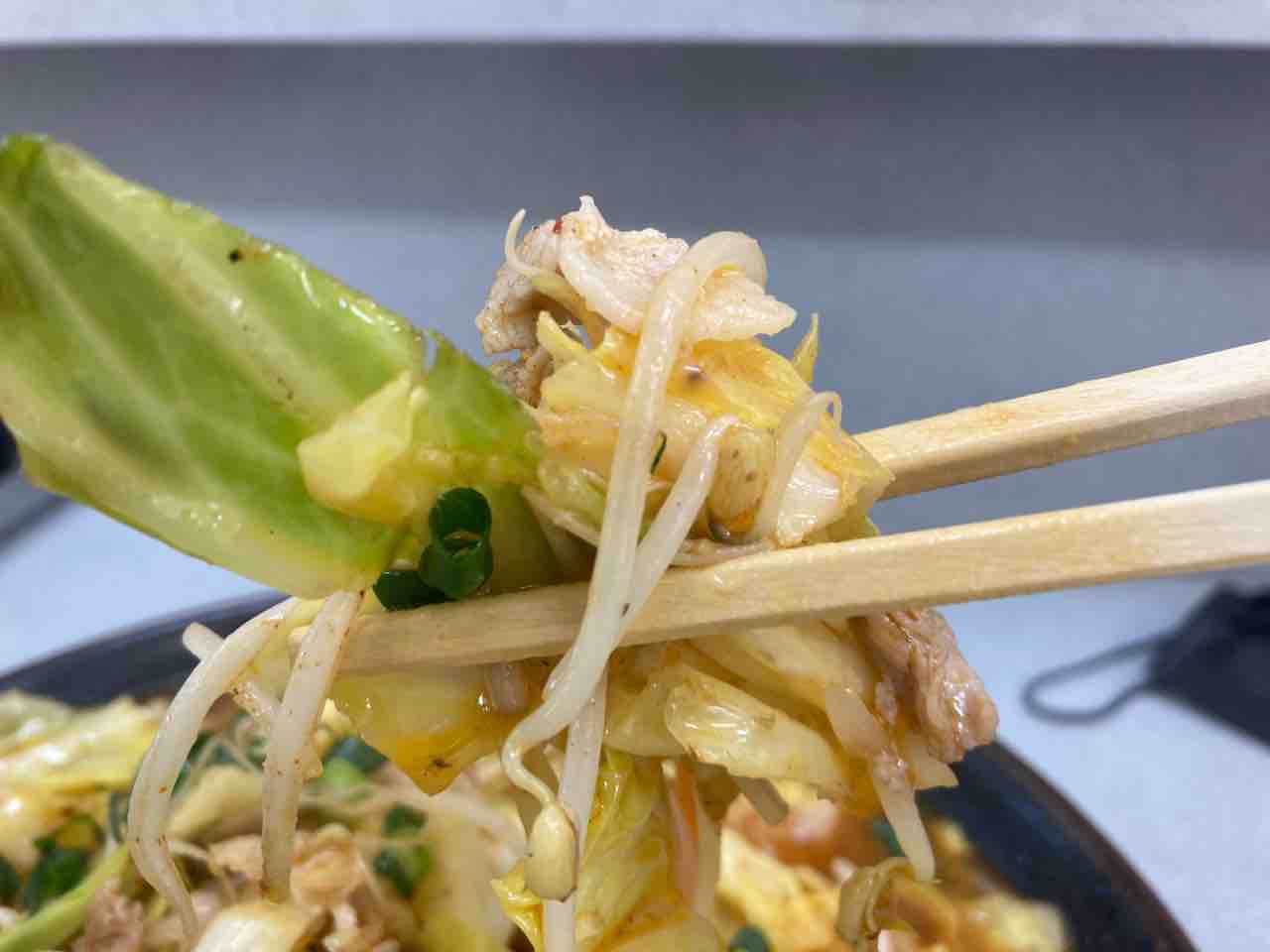 この、味噌ベースのキムチスープに馴染む、大量のキャベツ、もやし、豚肉の炒め物。