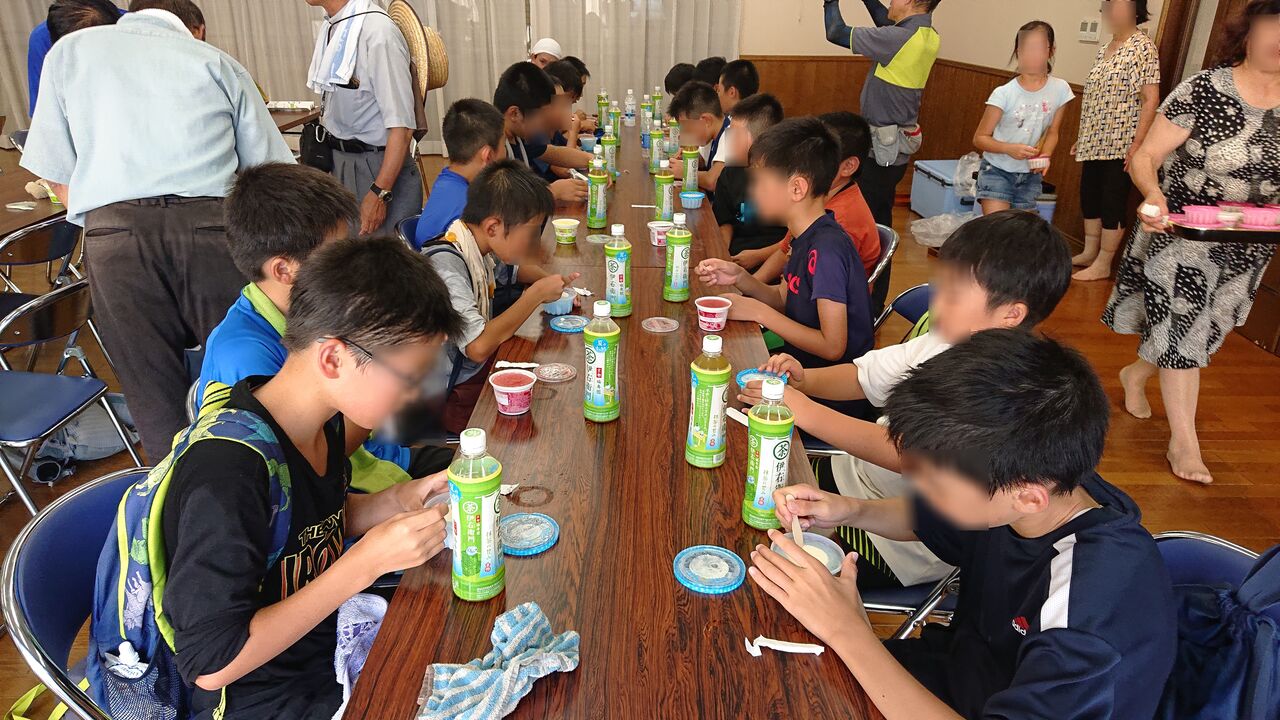 木陰や公園などで休憩をとることもありますが、道中には盛大にお迎えしてくださる地区もあります。エアコンの効いた公民館で、飲み物やアイスまで振舞っていただき、隊員たちも大喜びです。こういったおもてなしをしていただける地区が数か所あります。