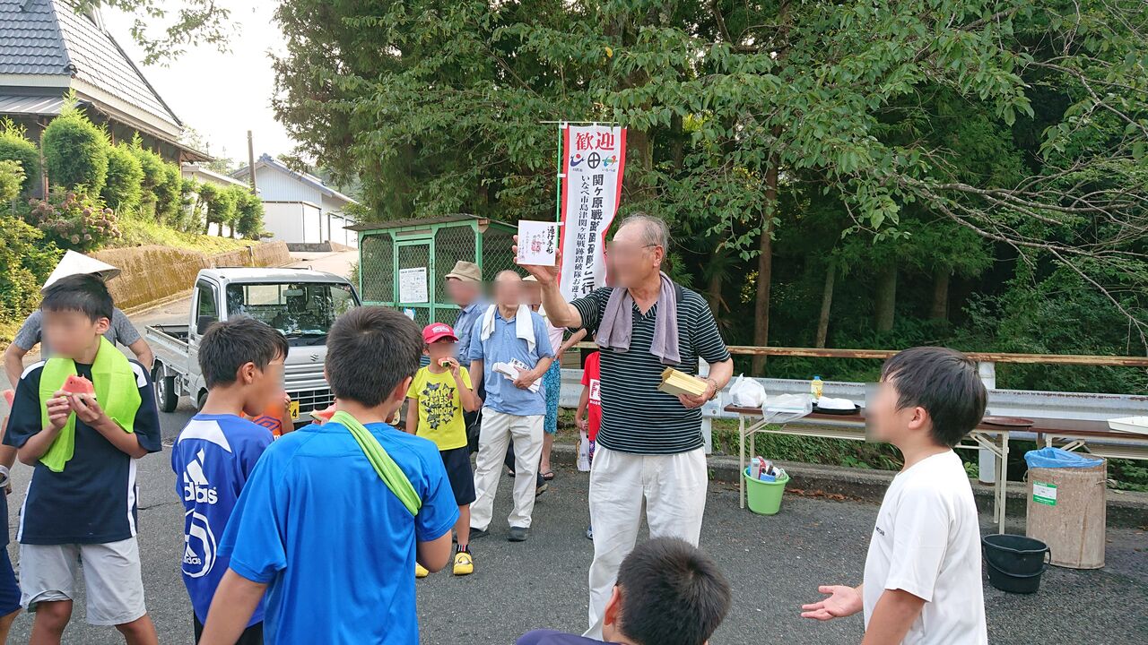 歩くこと4時間ようやく「鼎(かなえ)」に到着します。ここには薩摩武士のお墓といわれる塚があります。ここでは隊員による献花と祭文の奉納が行われます。そしてここでも地元の方々の盛大なおもてなしが待っていました。冷たい飲み物にスイカやメロンまで。隊員もおいしくいただきこれまでの疲れが吹っ飛びました。