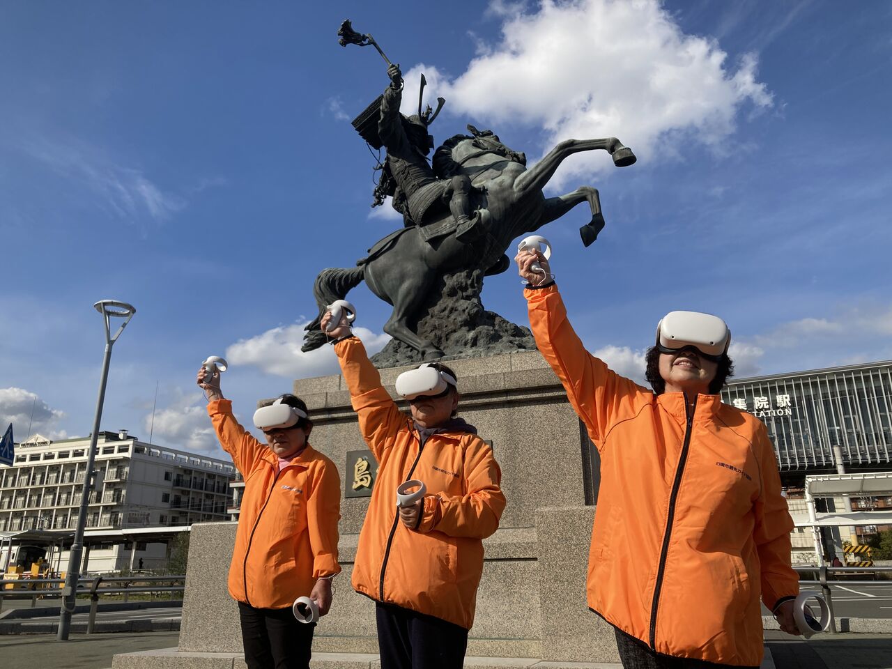日置市ガイド協会の方々が「義弘公騎馬像」の紹介をする様子(イメトレ)