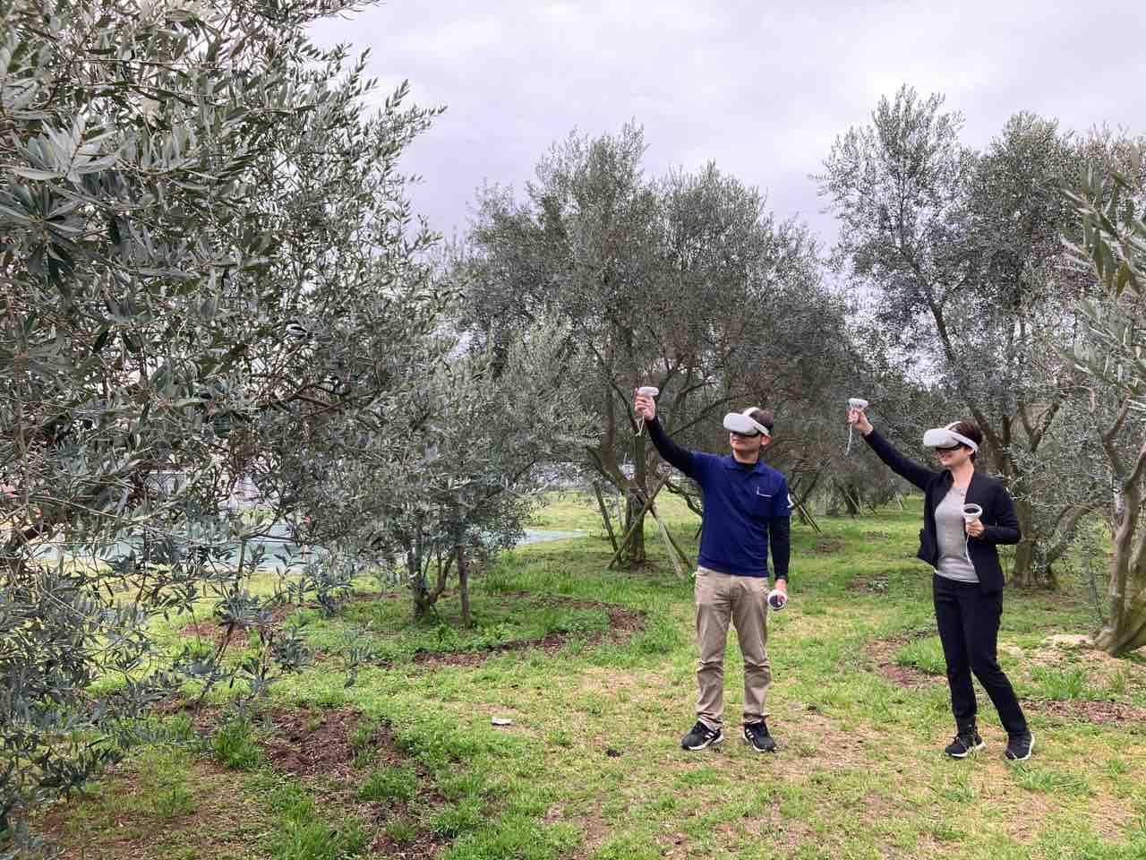 日置のオリーブの実はこんな風に育っておりますと説明する様子(イメトレ)