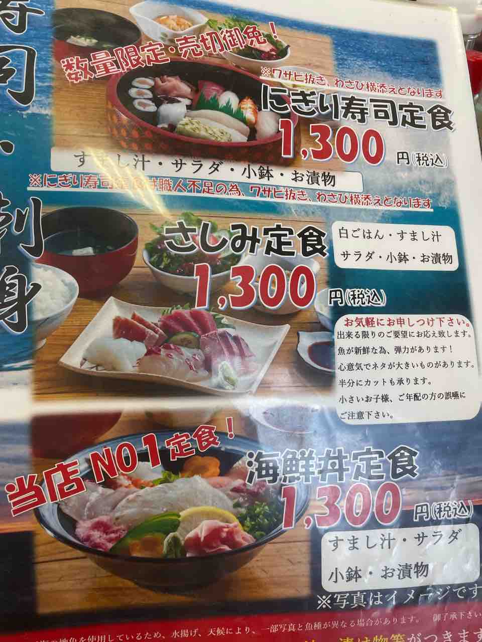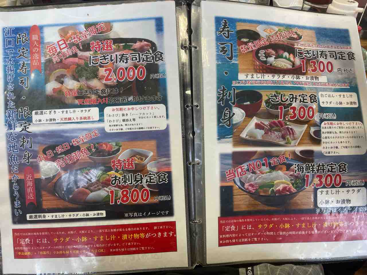 メニューにはお刺身からお寿司、海鮮丼、そして次ページにはフライや煮魚、鯛うどんとバラエティに富む