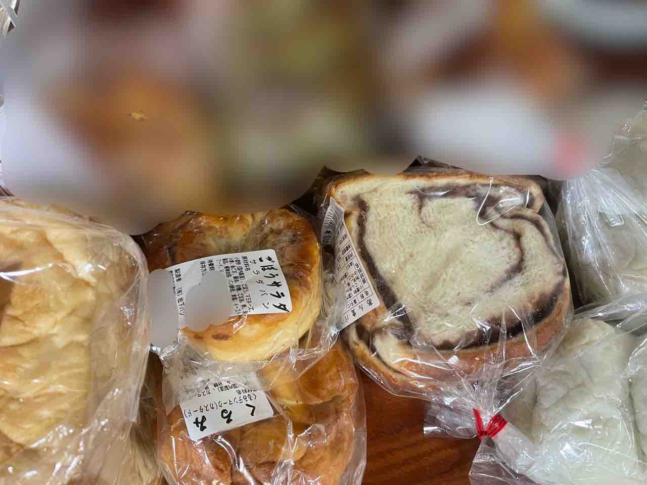 前田家や松下パン。ごぼうサラダ、あんしょく、くるみパン、食パン。特にあんしょくは柔らかく、優しい甘さのあんこと見事調和している。帰宅後に撮影。すべて美味しくいただいた。