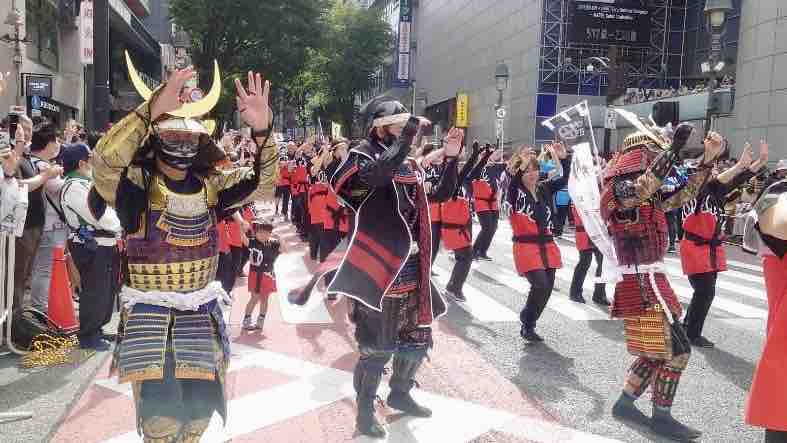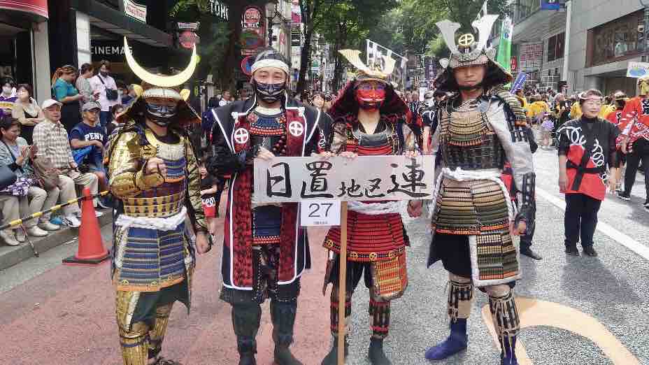 あれから20年、ようやくその渋谷おはら祭りに参戦することができました。日置市出身のメンバーで構成される「日置地区連」。そこに甲冑を着て、ひおきPR武将隊としての参戦です!