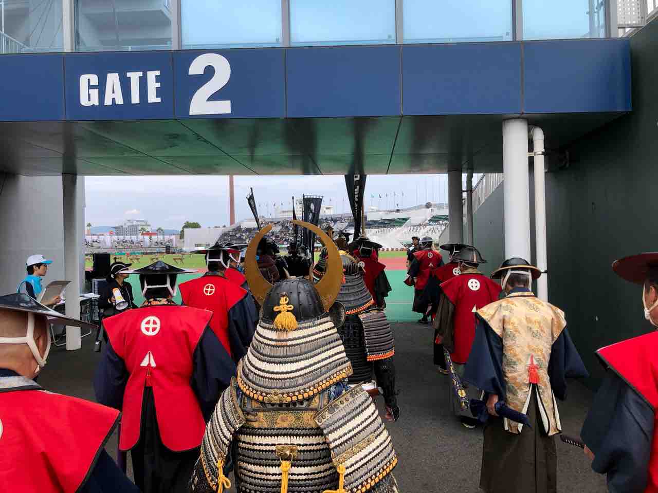 開会式の初っ端。開会と同時に入場し、鹿児島三大行事「妙円寺詣り」武者行列の一員として伊集院町妙円寺詣り武者行列保存会と会場内を闊歩するのだ。