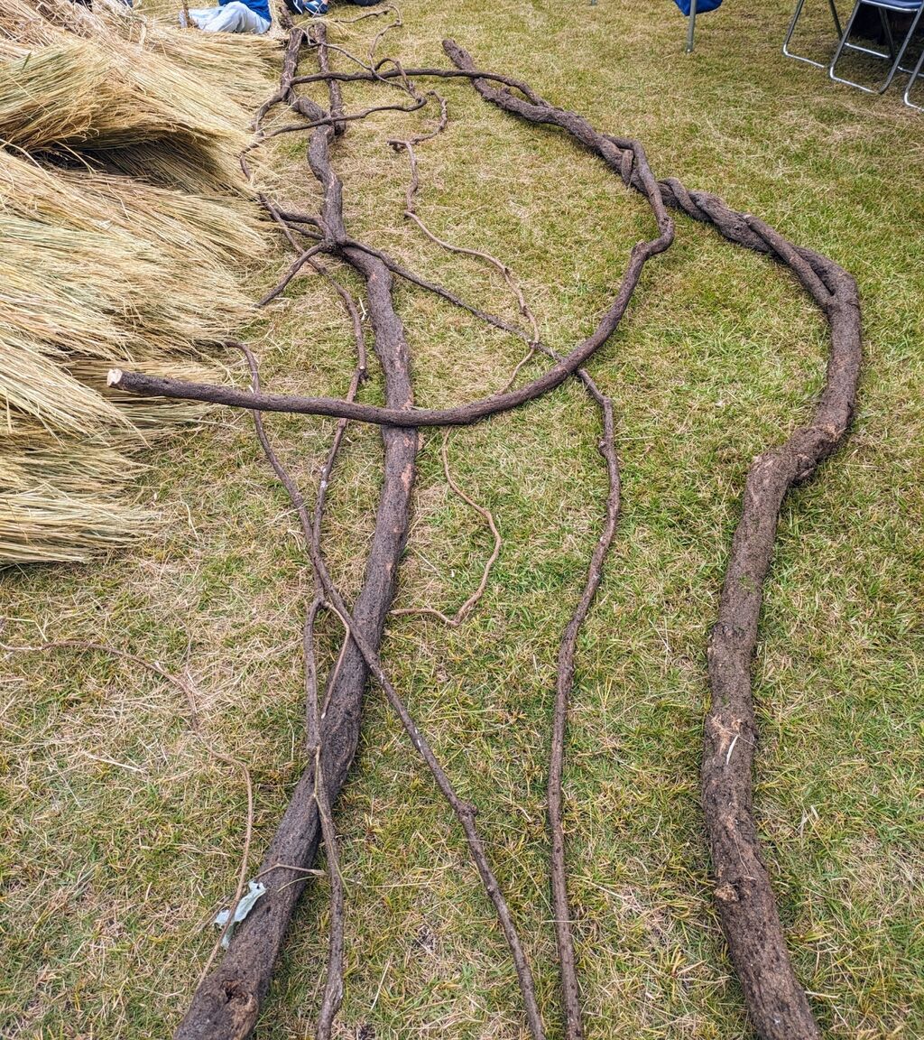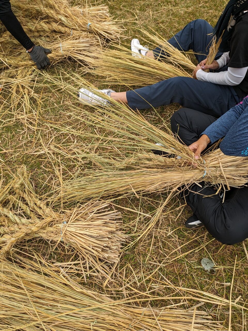 大人かいるところで編む。→編んだ部分を引っ張る(奥)→手前のカズラの芯が大人のところに行く→ワラを編み込む。 の繰り返します。