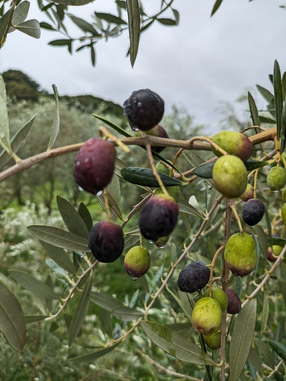 オリーブちぎり実は、緑を想像しますご、だいぶ、熟して赤紫色になってきてますね。