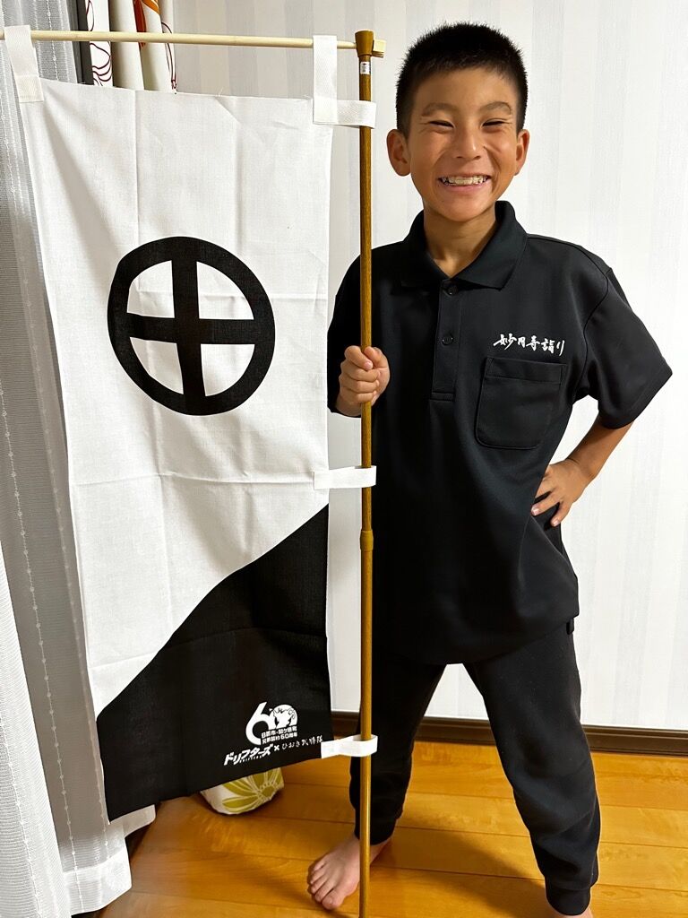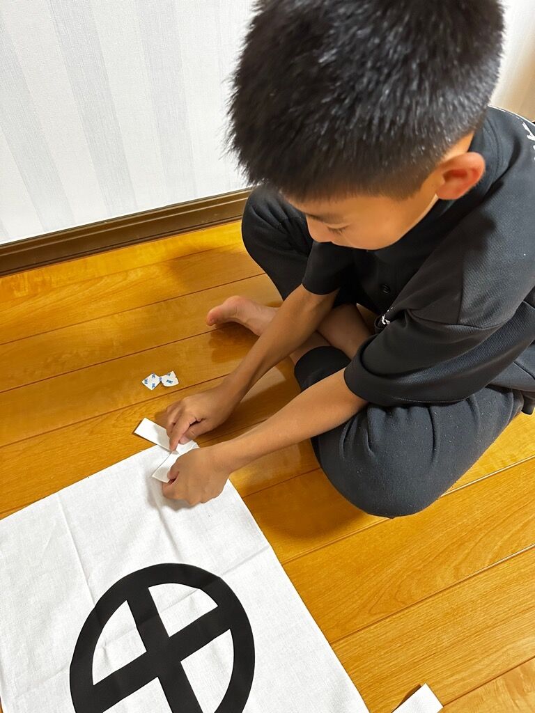 立派な軍旗が出来上がりました!息子は戦国好きということもあり嬉しすぎて目が線になってますね(笑)。