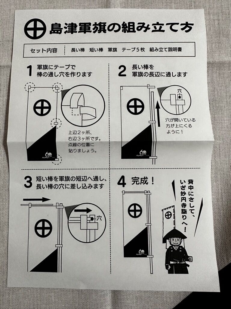 軍旗の入っている袋を開けてみると「島津軍旗の組み立て方」が中に入っていました。これを見ながら作れば上手くいくのかなと!お写真何枚か載せておきます