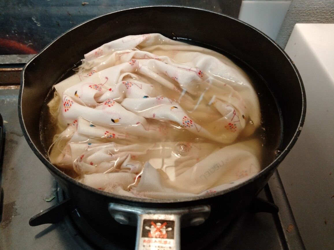 そこに一度洗った木綿の布を入れ、コトコトと15分ほど煮ました。