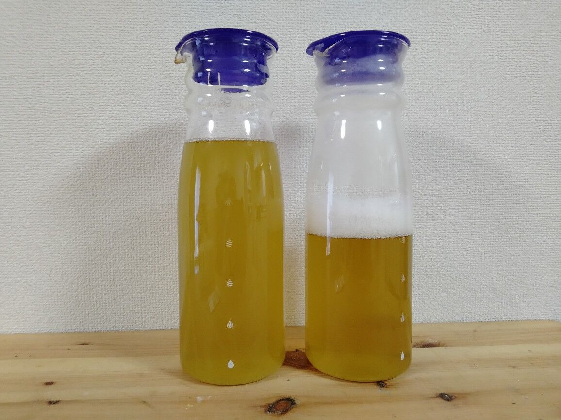 煮出した液を一度瓶に集めてみました。茶色っぽい黄色の液になりました。