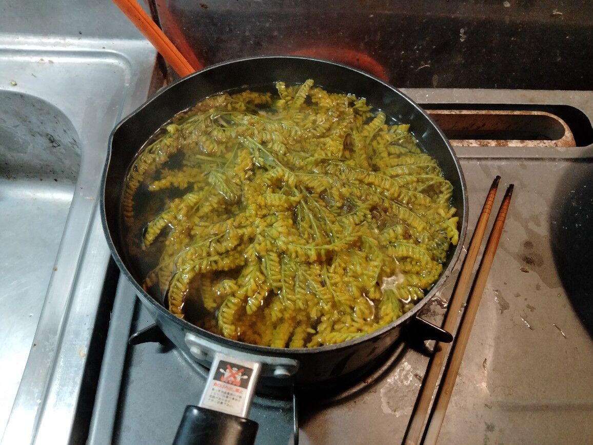 水で軽く洗って虫などを落とし(屋外で洗うことをお勧めします)、水の入った鍋に投入。
