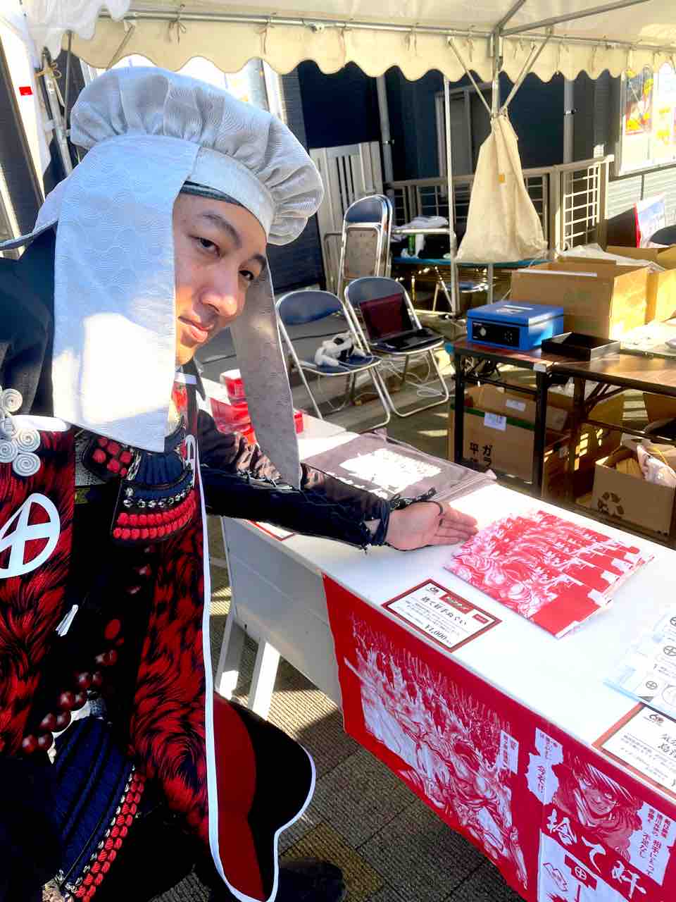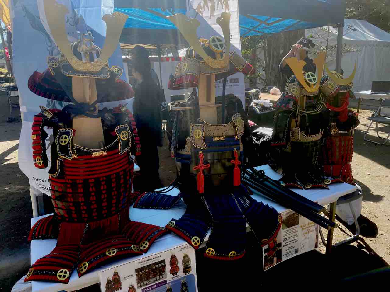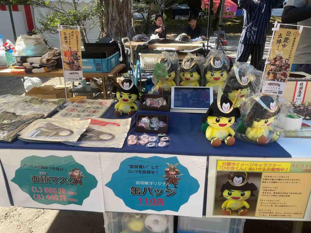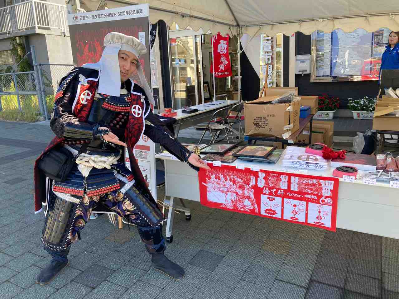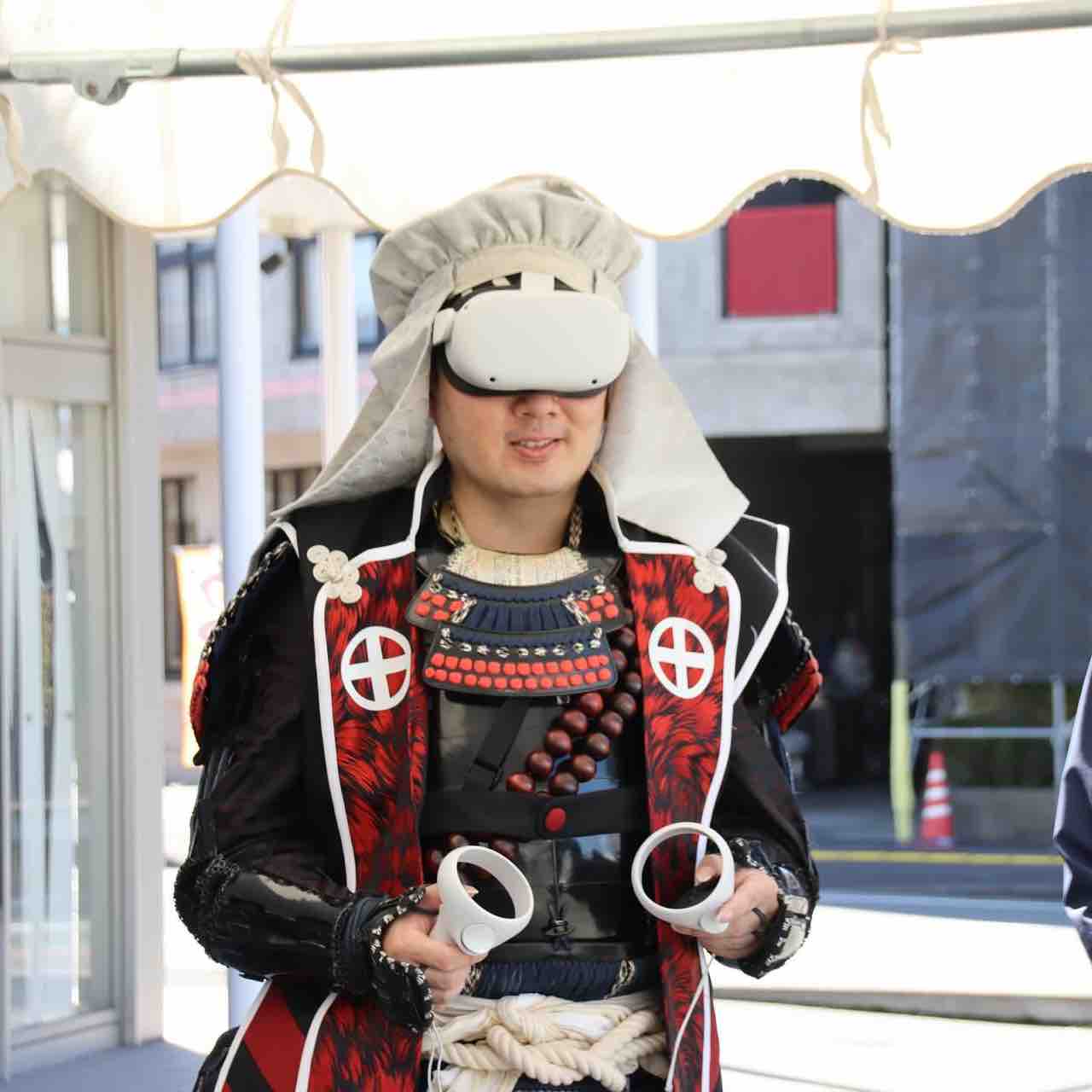 日置市ブースではグッズはもちろん、甲冑着付けやVR島津義弘の体験を行なっていた
