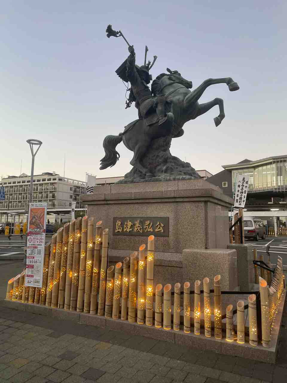 今年も義弘公の銅像には竹灯籠が点された