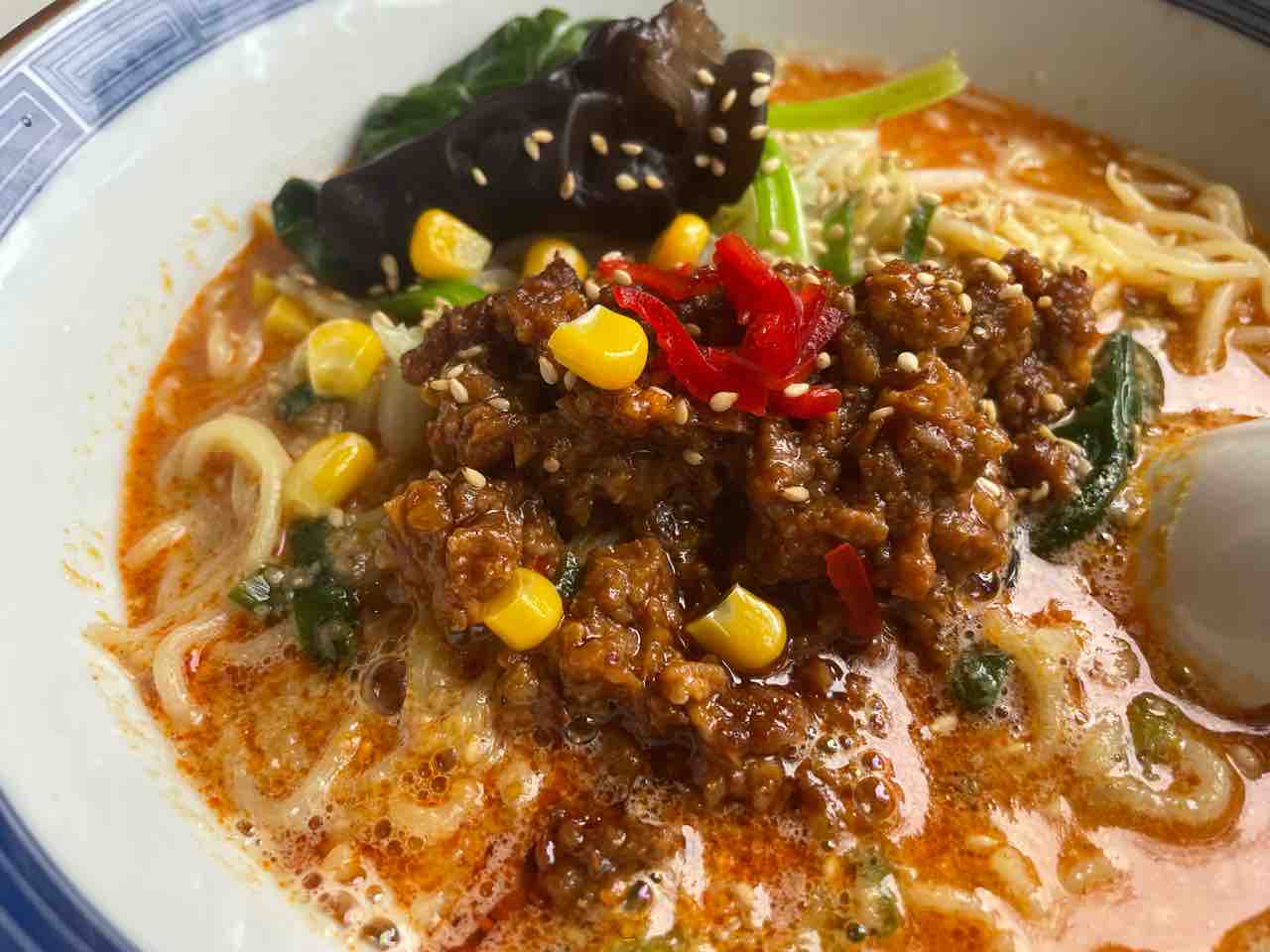 確かにスープは赤めだが、ひき肉の茶色、コーンの黄色、ほうれんそうの緑、きくらげの黒、パプリカの赤、麺の黄色、胡麻の白。