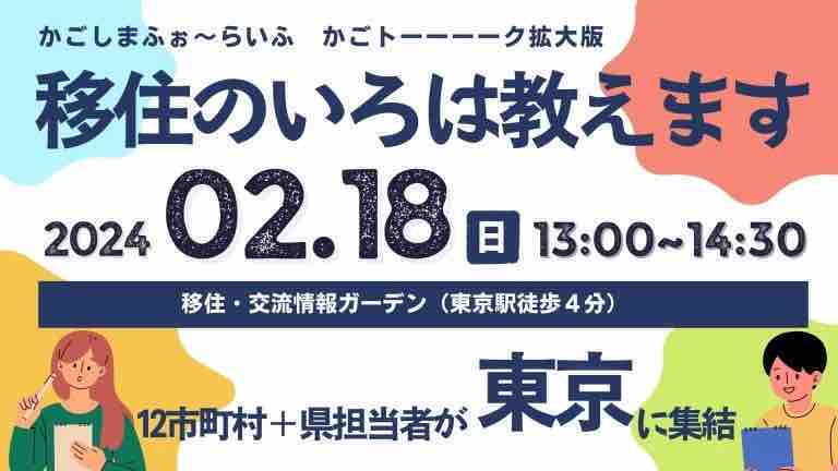 鹿児島から12市町村+県の担当者が東京に集結!先輩移住者も参加します。「移住って何から始めたらいいの?」「どんな準備をすればいいの?」というあなたの疑問にお答えします。移住先や移住時期が決まっていない方にもおすすめの内容です。