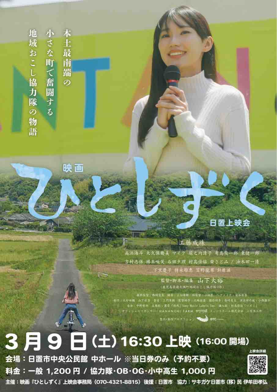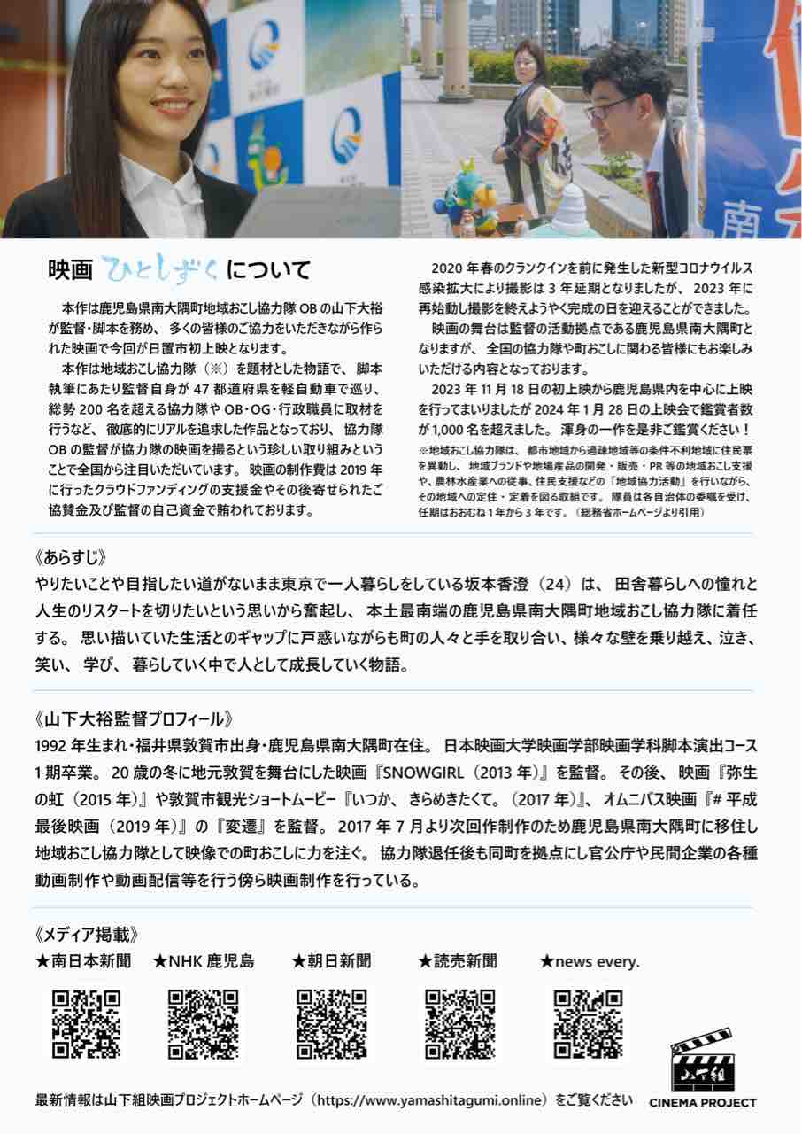 本作は鹿児島県南大隅町地域おこし協力隊OBの山下大裕が監督・脚本を務め、 多くの皆様のご協力をいただきながら作られた映画で今回が日置市初上映となります。本作は地域おこし協力隊を題材とした物語で、 脚本執筆にあたり監督自身が47都道府県を軽自動車で巡り、総勢200名を超える協力隊やOB・OG・行政職員に取材を行うなど、徹底的にリアルを追求した作品となっており、協力隊OBの監督が協力隊の映画を撮るという珍しい取り組みということで全国から注目いただいています。