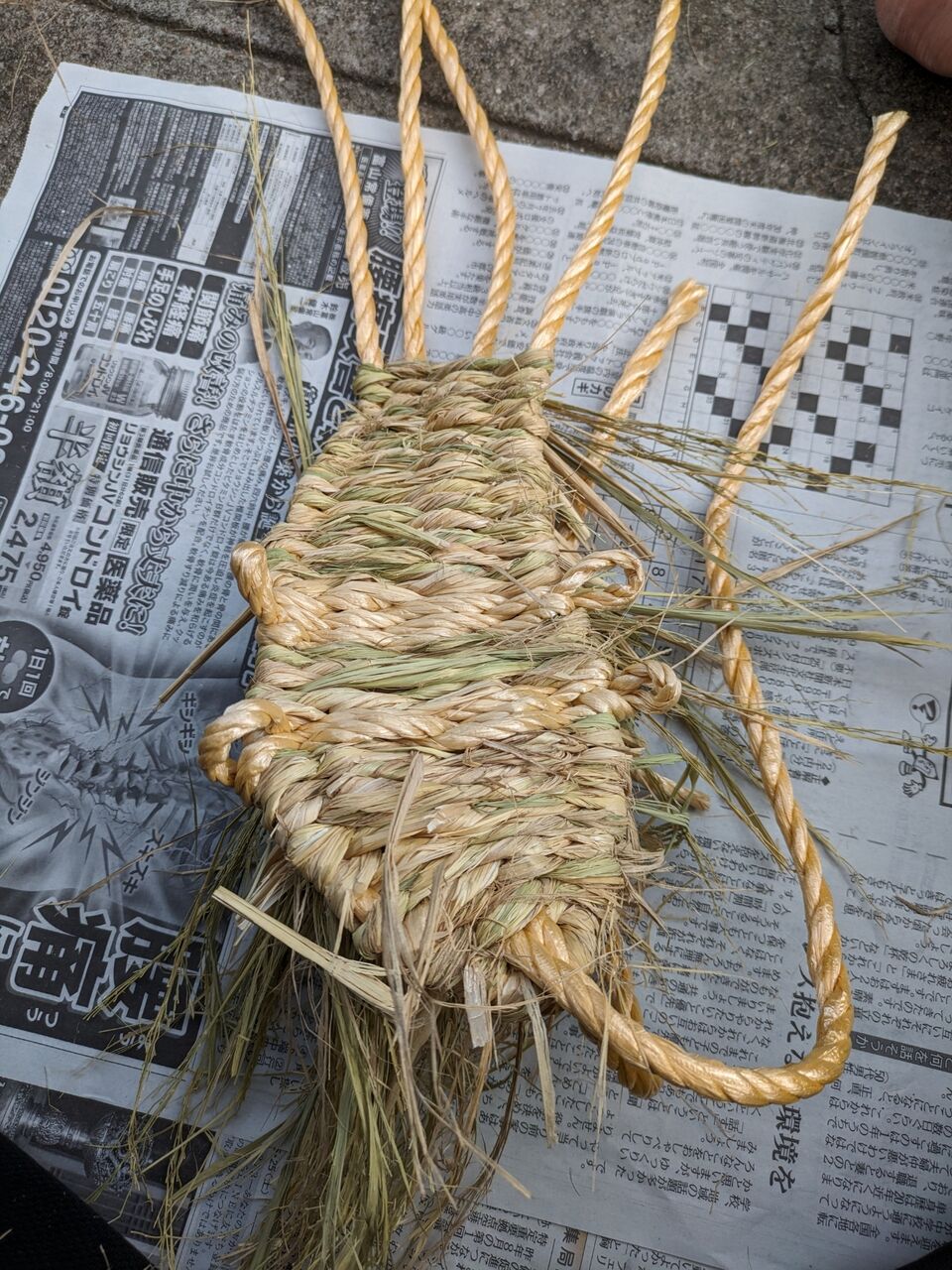 ほぼ完成です。 あとは、裏のわら先を整えて、紐を調整したら、完璧です。