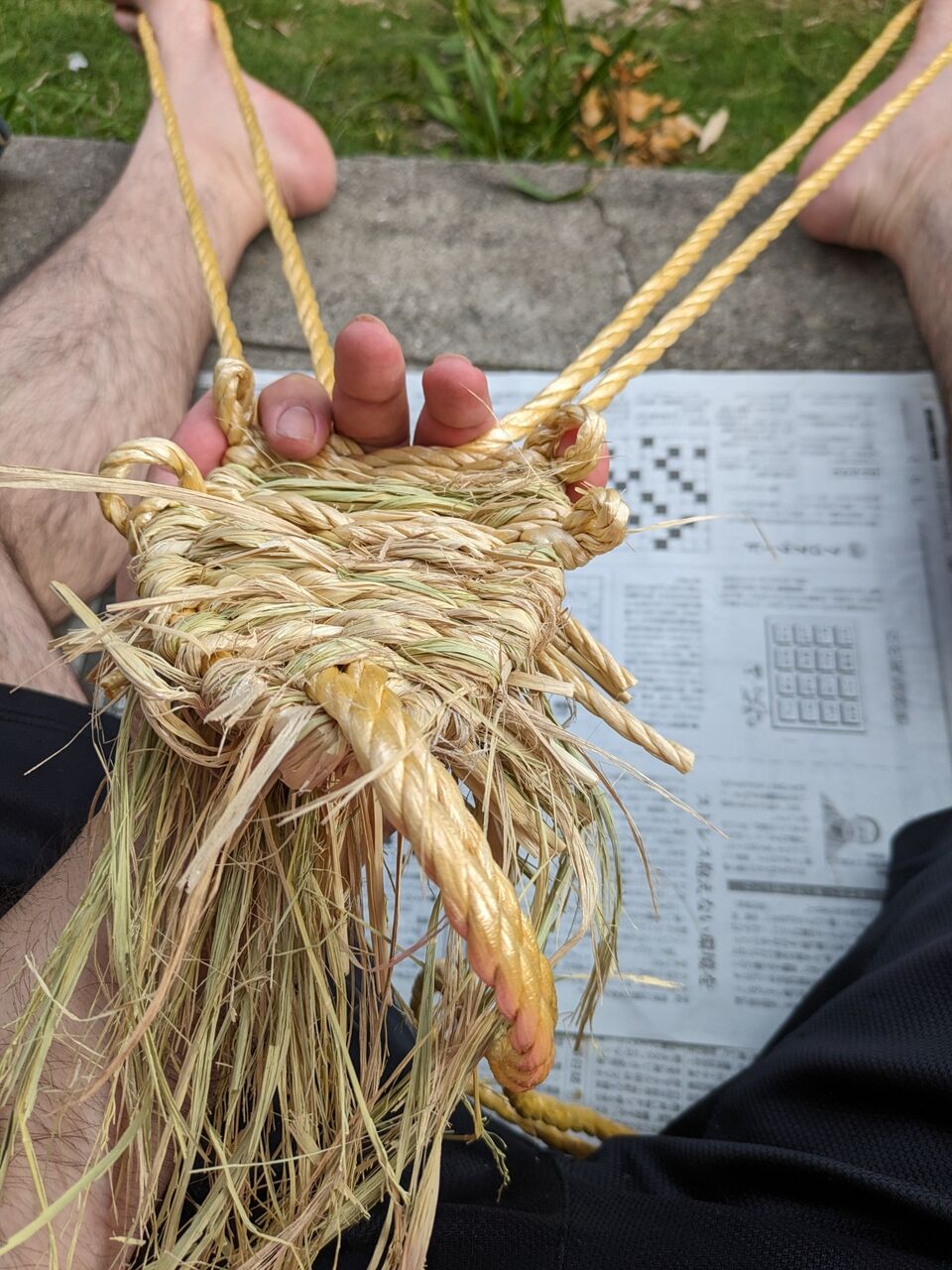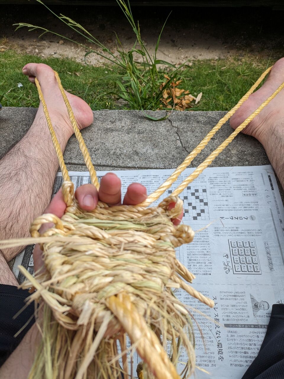 足で紐を張りながら、手でワラを詰めながらあみます。