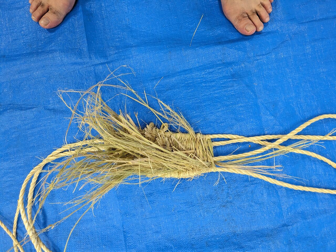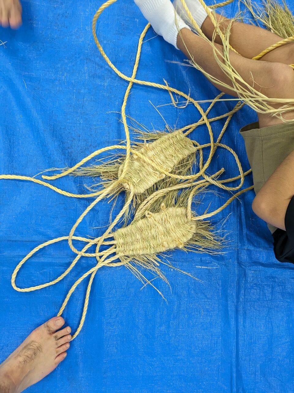 足で紐を挟んで、ワラを編んでいきます。