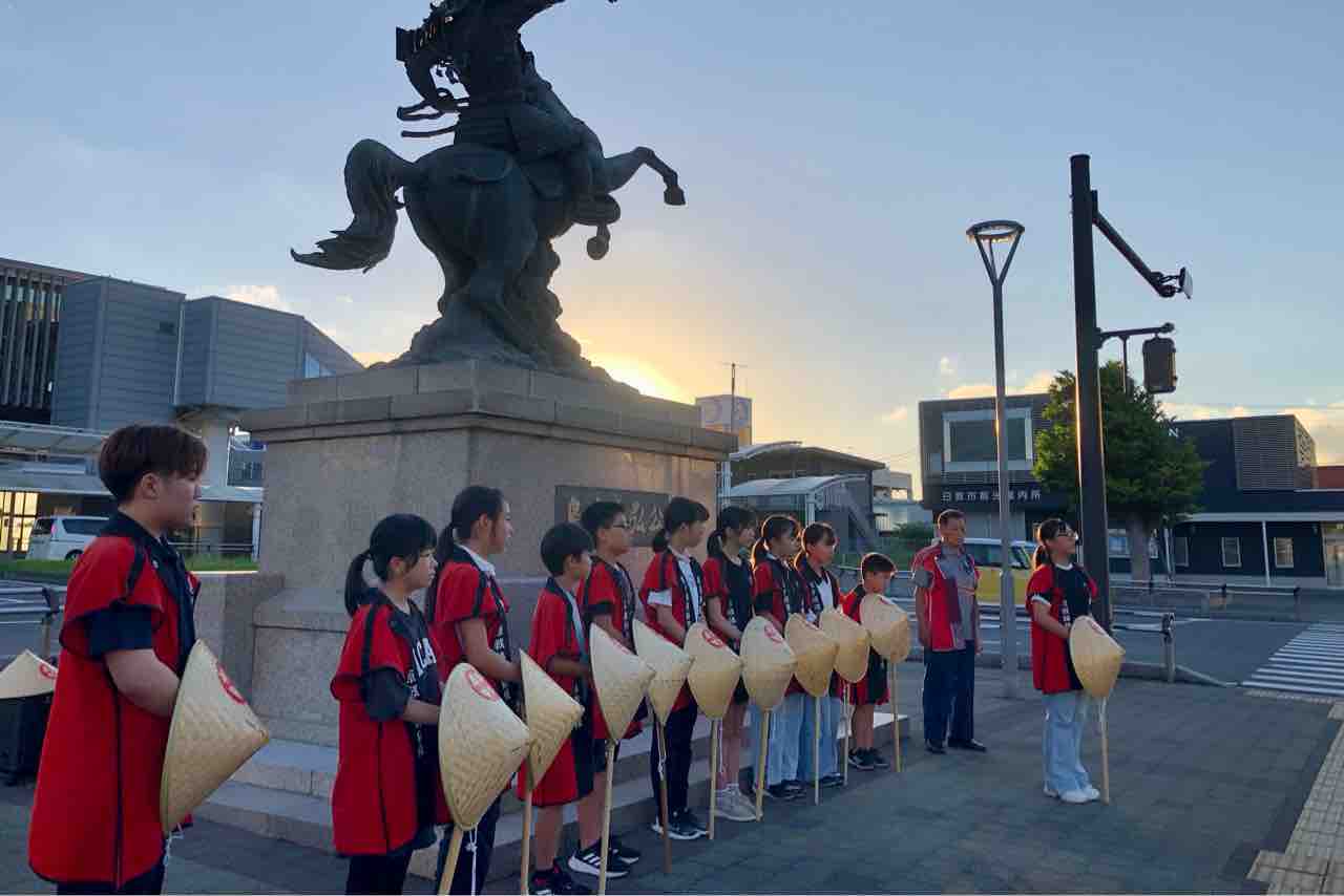 伊集院駅前で朝日を浴びる義弘公。