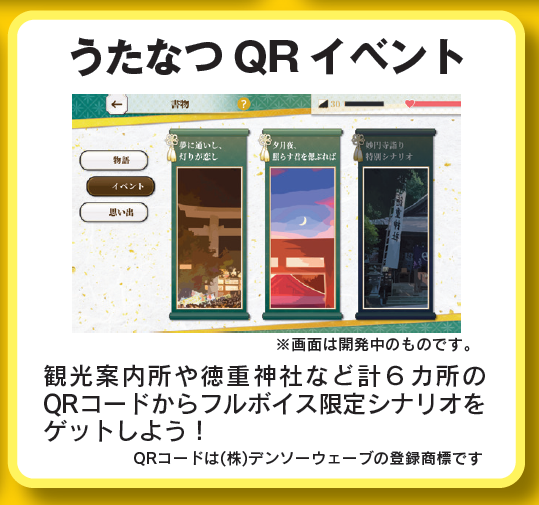 「うたなつ」ゲームアプリ内で、以下の場所6か所に設置してある「うたなつポスターパネルのQRコード」を読み込むと、フルボイス限定シナリオが楽しめるというもの!