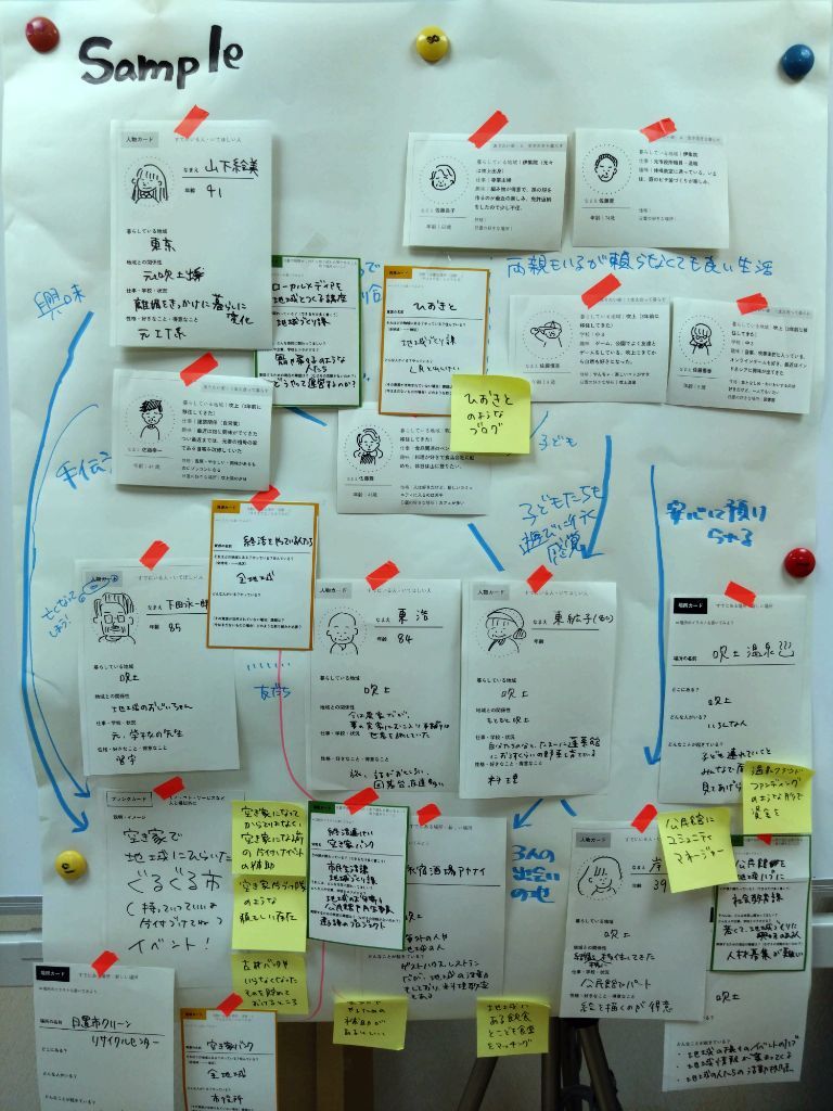 2035年の日置で暮らす仮想の人物像やありたい姿を実現するために必要な活動や資源をつなげていきながら相関図を作成しています。