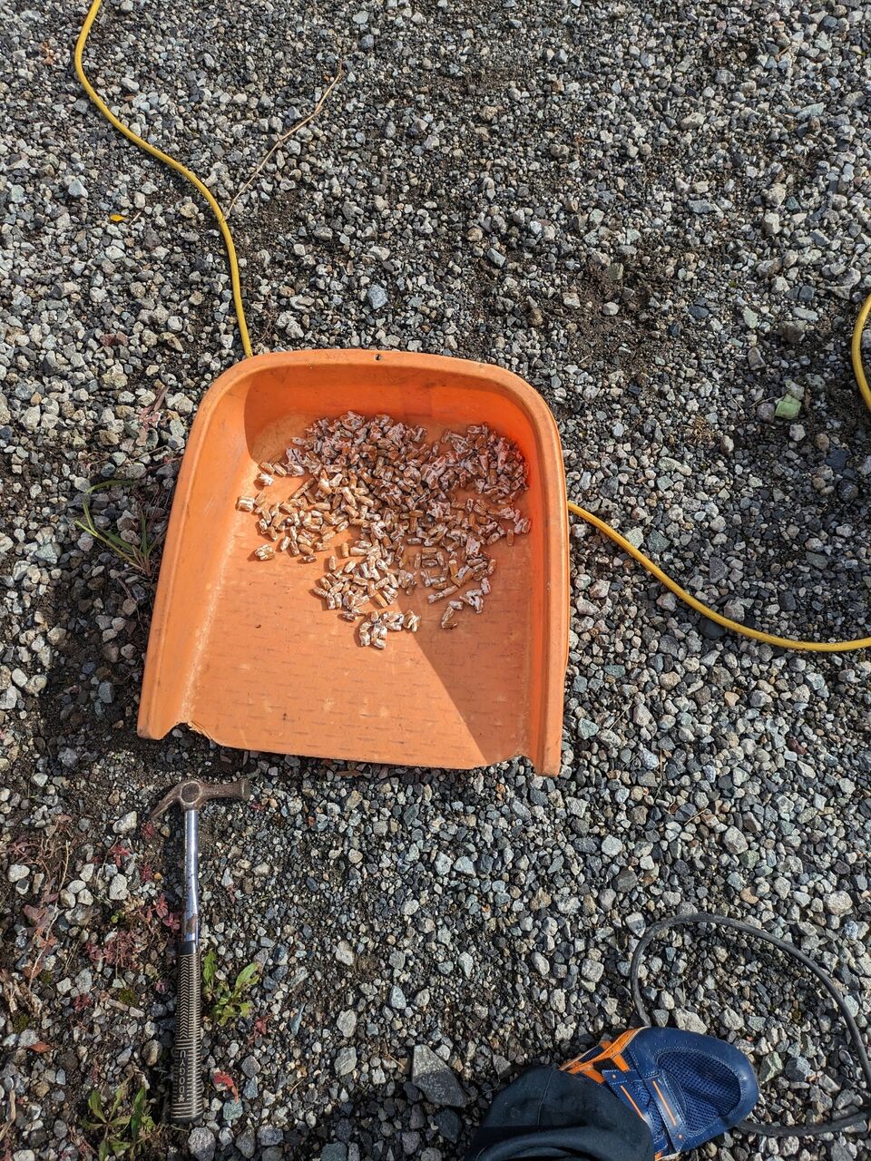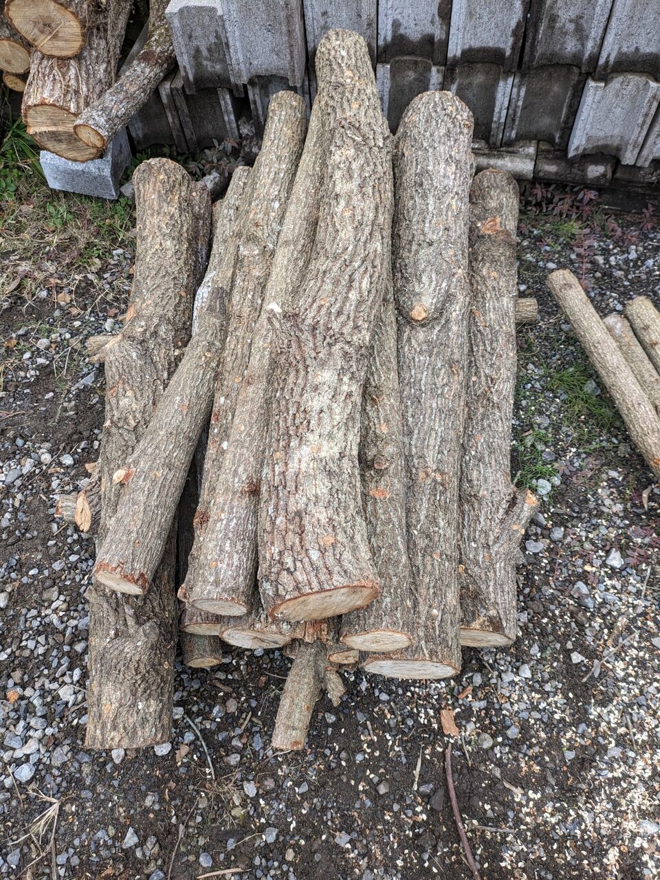 ひおきの暮らし ひおきの住まい 原木しいたけ道 駒打ち開始。 2024.12.1 せっぺとべお せっぺとべおです。 我が趣味の、原木しいたけを作りますよ〜。玉切りして、1ヶ月程経ちました。駒打ちしま〜す。昨年、購入した、駒打ち用ドリルで穴開けます。間隔はテゲテゲです。駒も準備完了。 加勢が多くて、穴開きが追いつきません。まだまだ、開けないといけません。木くずがいっぱいです。打ちましたよ。完成です。 後は、菌が回るように、しばらく寝かせますよ。