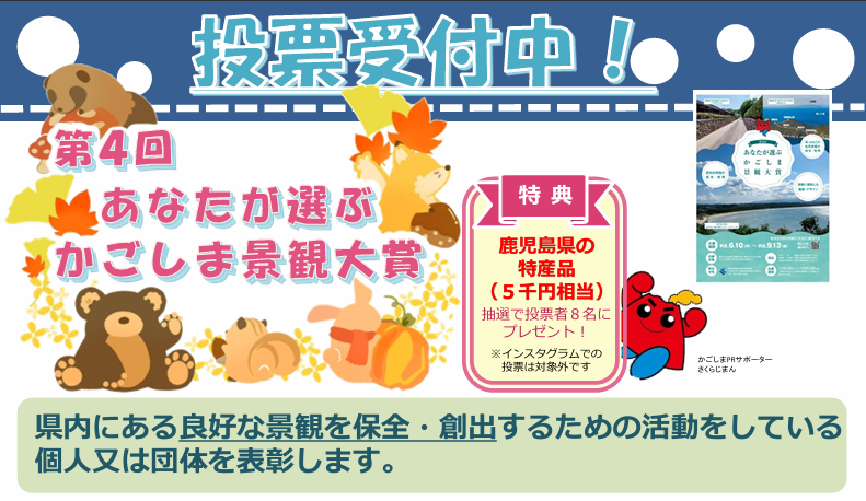 県内にある良好な景観を保全・創出するための活動をしている個人又は団体を表彰するもので、みんなで選ぶ企画となっております。