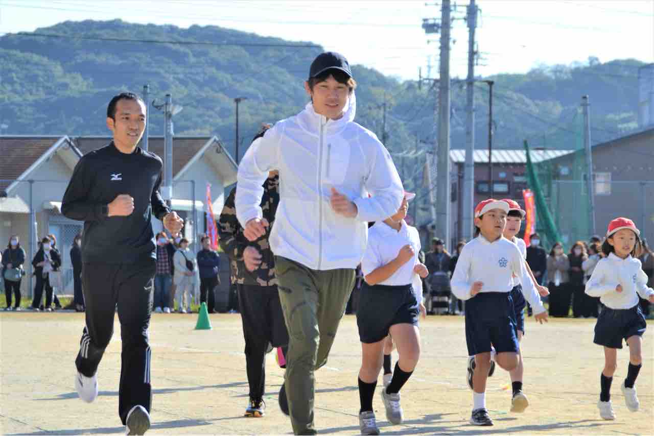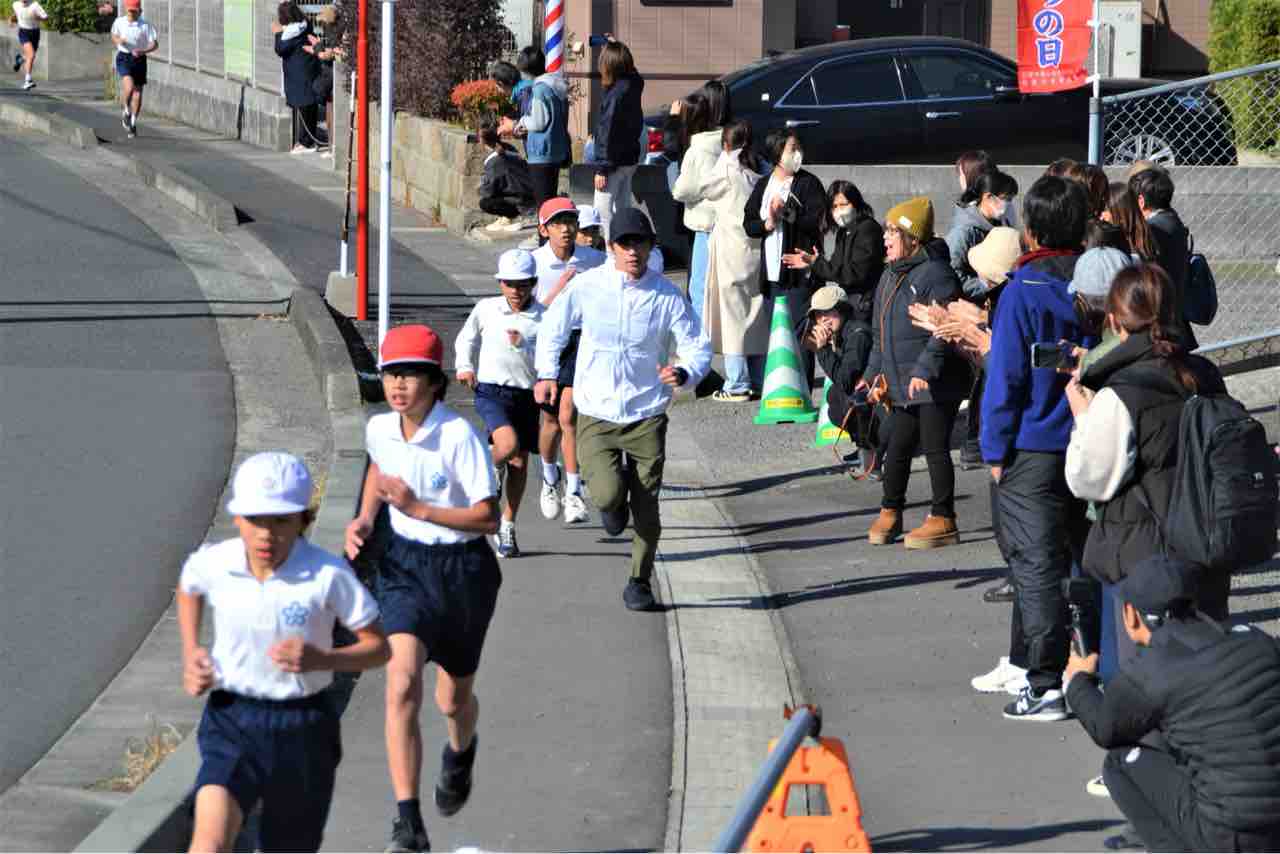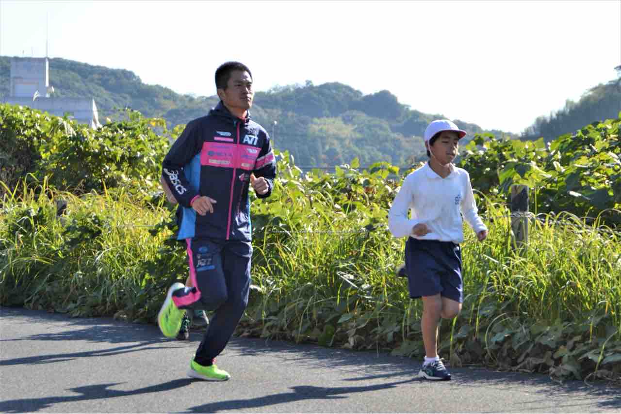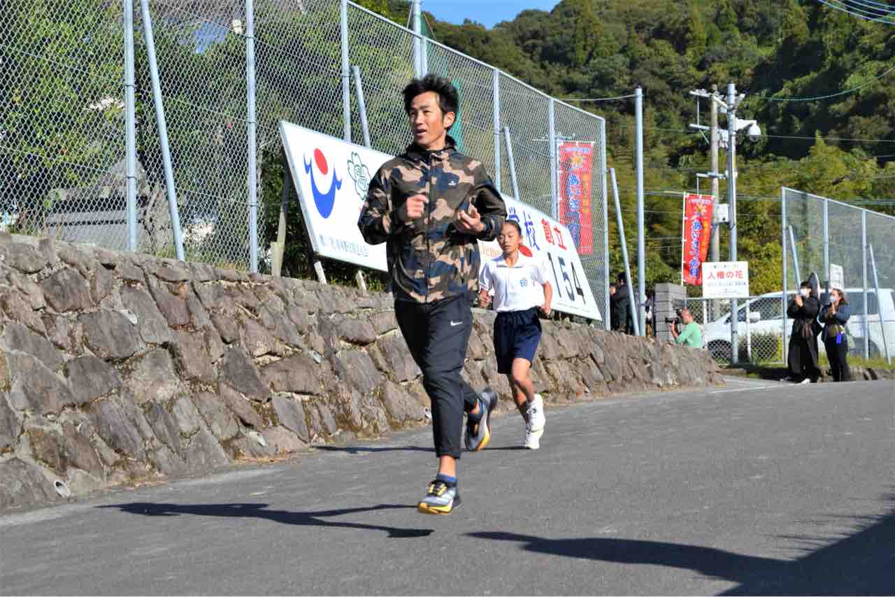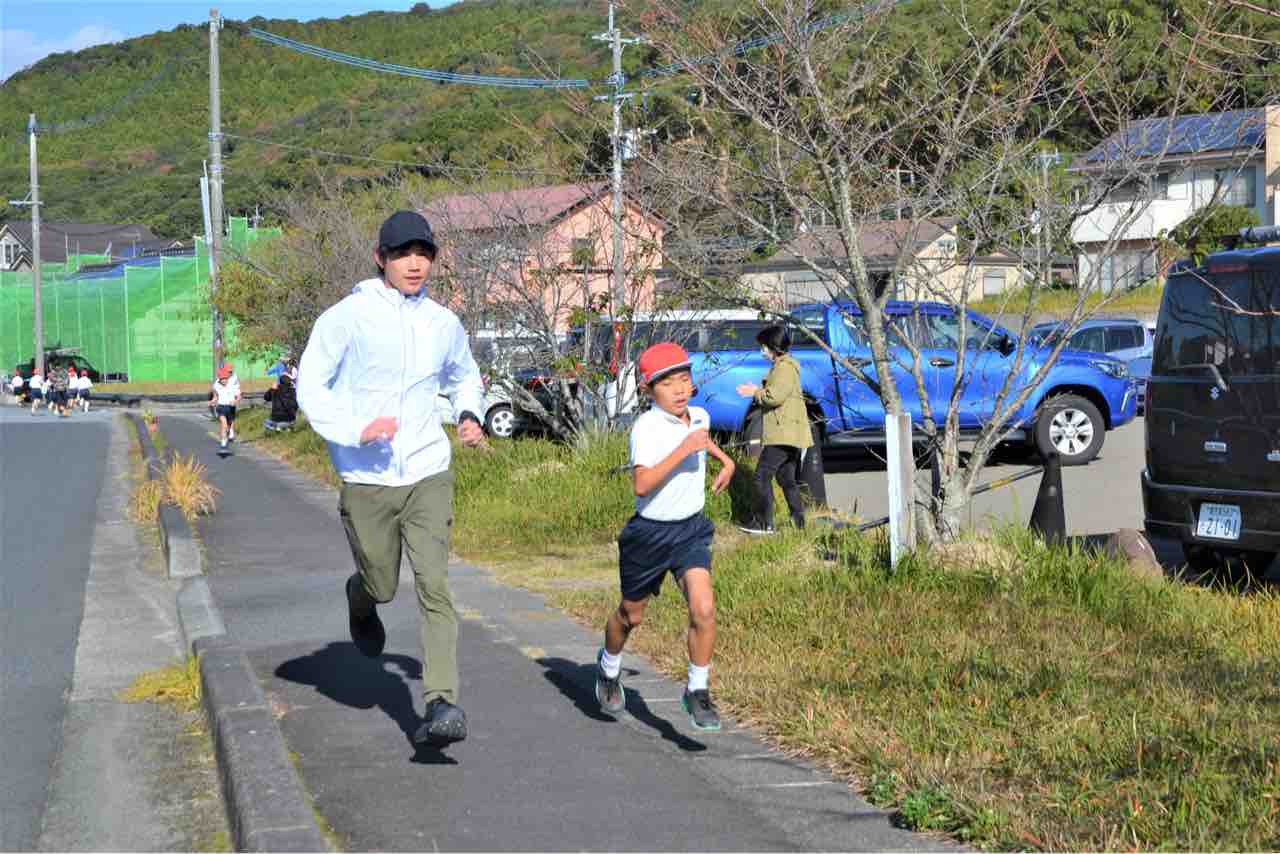 有馬拓美さんも綺麗なフォームで児童を先導します!元県下一周駅伝日置チームのエースが走っているのを見れて感動しました!