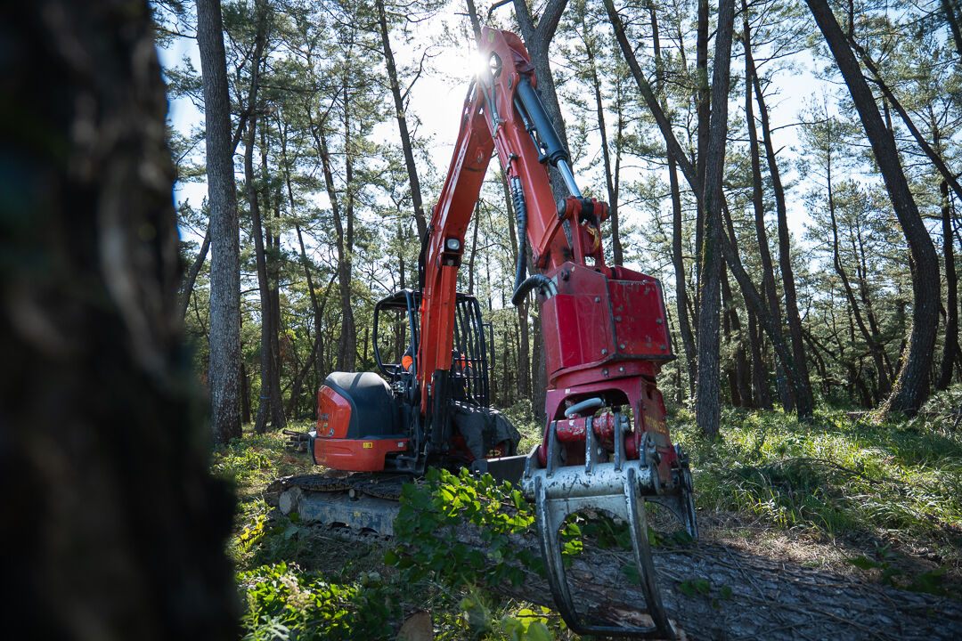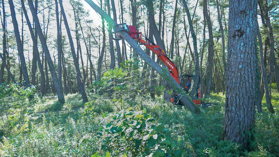 チェーンソーで伐採した木が倒れないように重機で支える作業は、