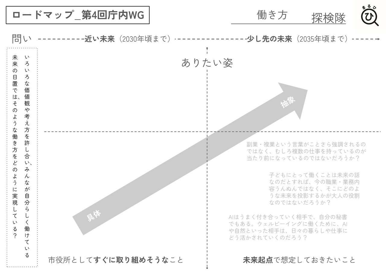 探検隊ごとに作成したロードマップは、庁内ワーキンググループで編成したグループ内で共有し、別の探検隊からも意見をもらいました。