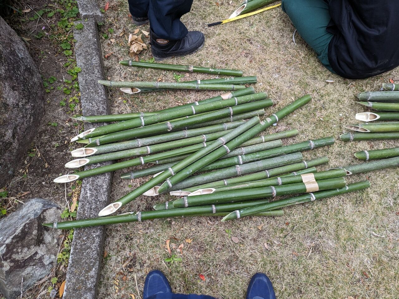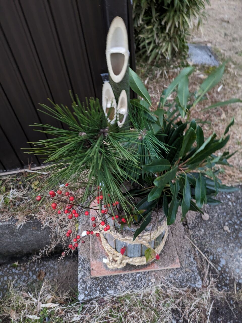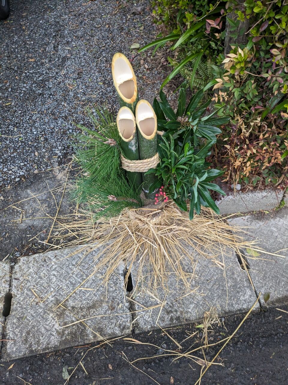 ひおきの暮らし ひおきの住まい 正月準備を始めましょう。 まずは、門松づくり。 2025.1.2 せっぺとべお せっぺとべおです。正月気分を出すため、まずは門松づくりでしょう。竹を切って、ナナメにします。 節のところを切るのが、ポイントです。ほら、こんな感じ。松をゲットユズリハもゲットシラスを準備して。赤色の実は、南天です。もちろん、竹で周りを作って荒縄で3回巻いて完成。こっちは、ワラで巻いた、バージョンです。正月が楽しみです。