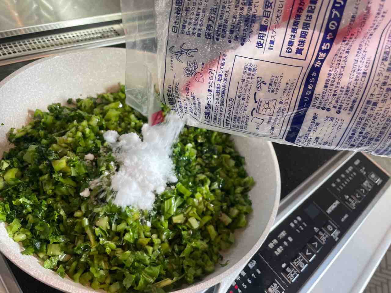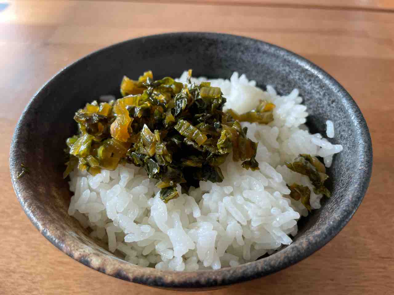 完成した高菜を、白米の上にライドオン!!!