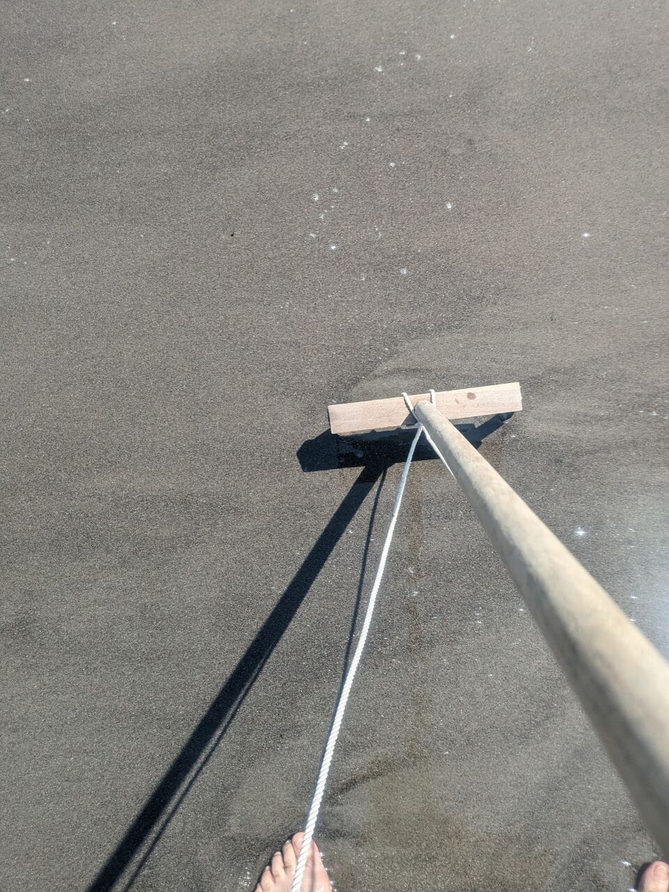 紐を腰に掛けて、砂に金具部分を入れて、引っ張って行きます。