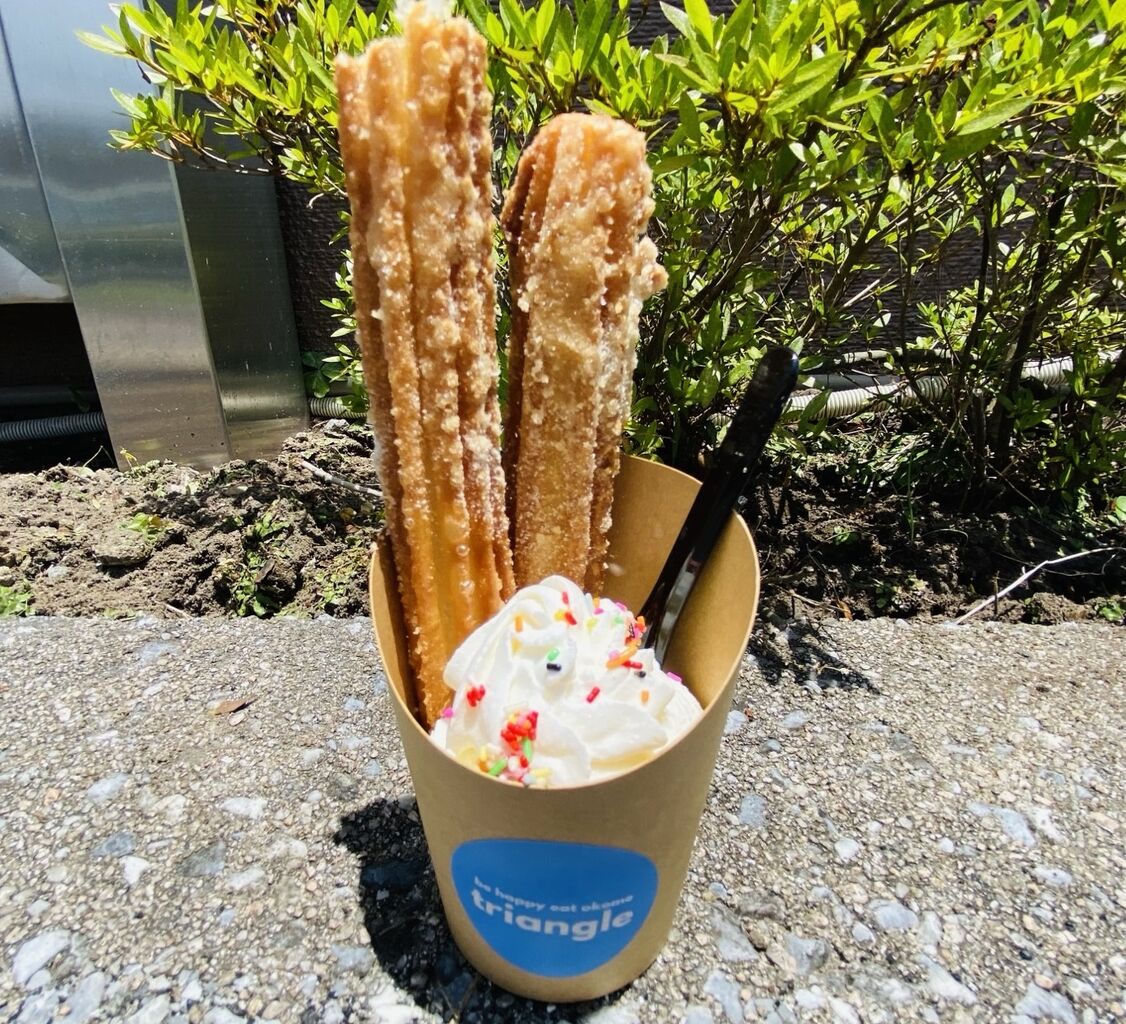 チュロス(揚げ物スイーツ)と冷たいジェラートを交互に食べられる贅沢なスイーツで、