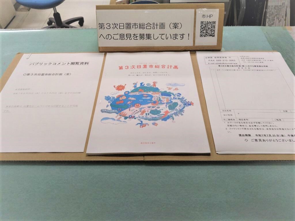 日置市役所本庁、各支所や市内26か所の地区公民館に計画案と意見提出用紙を設置し、閲覧と意見を提出できるようにしています。