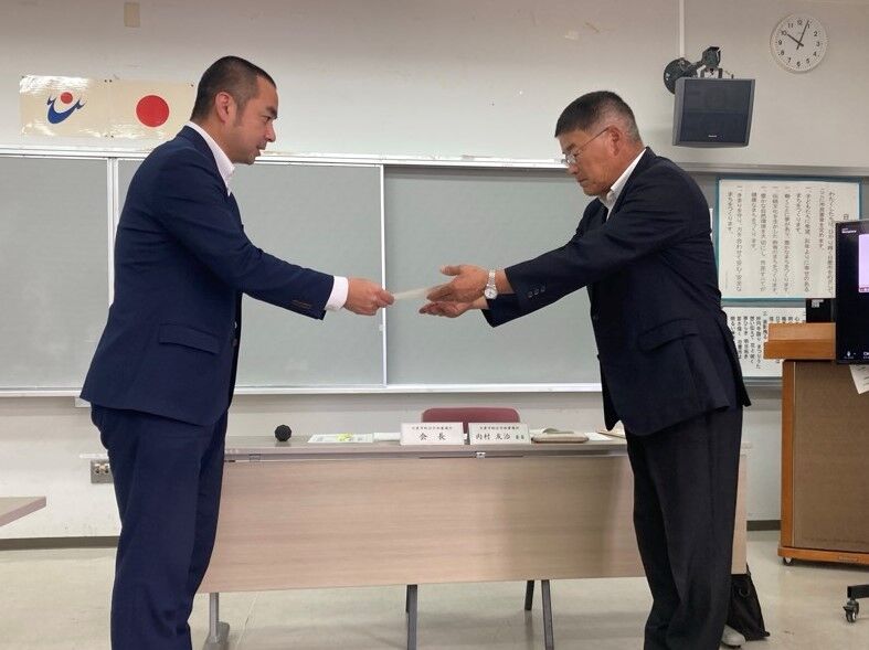 ↑市長から総合計画審議会の会長へ諮問書を手渡ししている写真