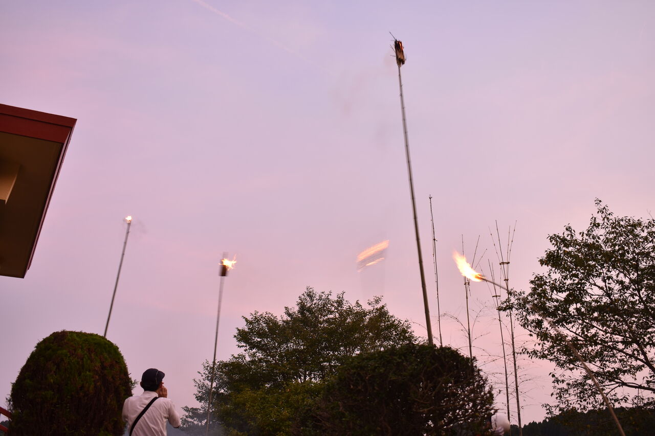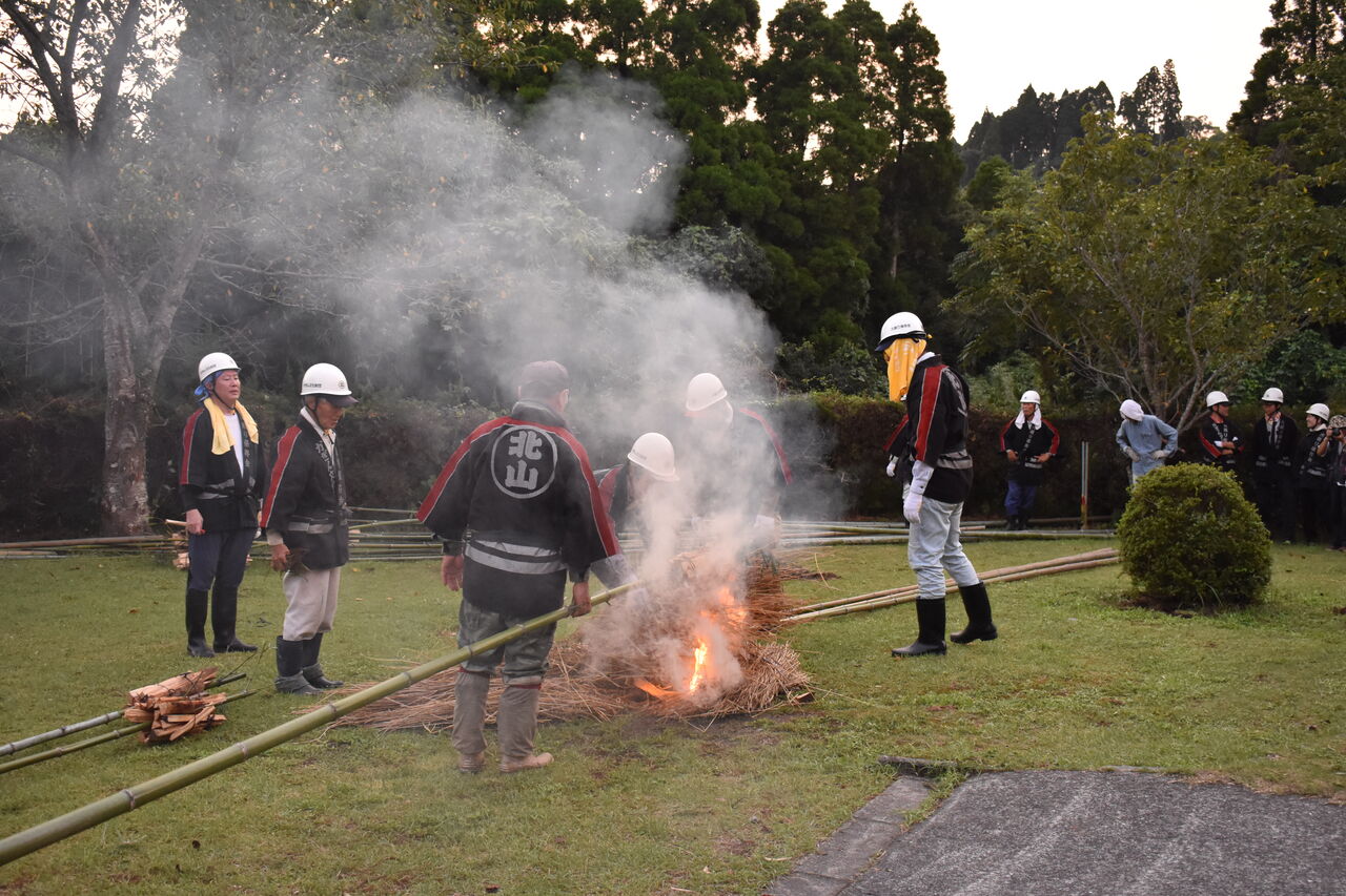 日が暮れようとする頃、地元の方が孟宗竹の先端のくくりつけたたいまつに火をつけ始める。