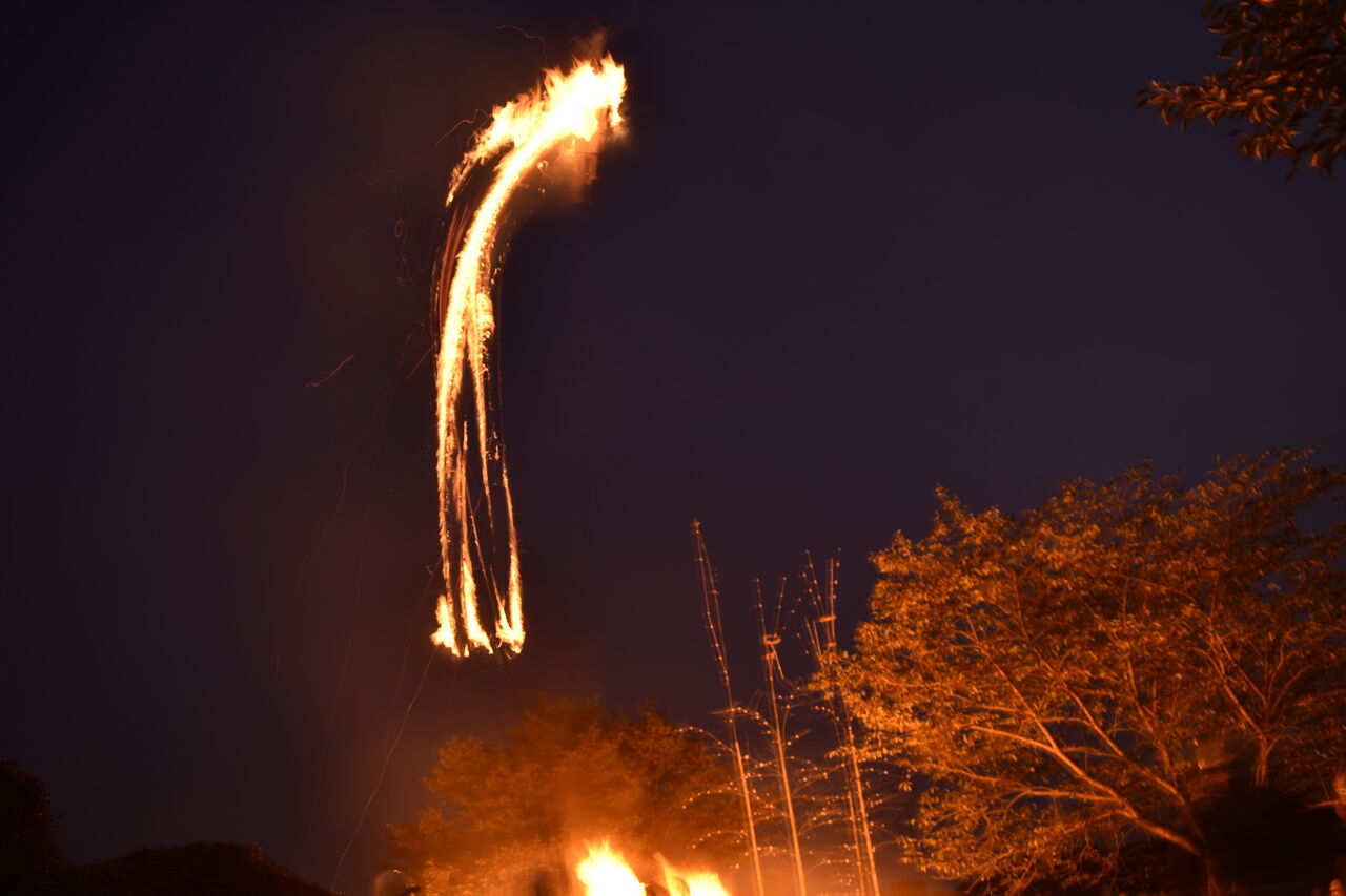 夏の夜空を焦がす炎の柱は勇壮また幻想的だ。